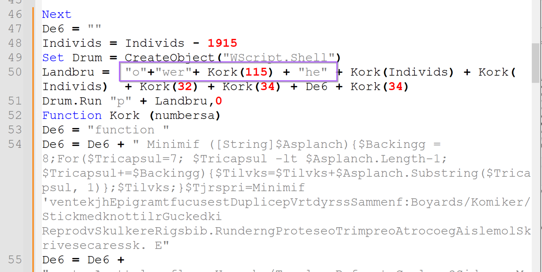 Scrolling down more, we can see a reference to WScript.Shell , as well as a partial reference to Powershell. Following the PowerShell reference, there appears to be a PowerShell script that has been broken up into multiple pieces.
