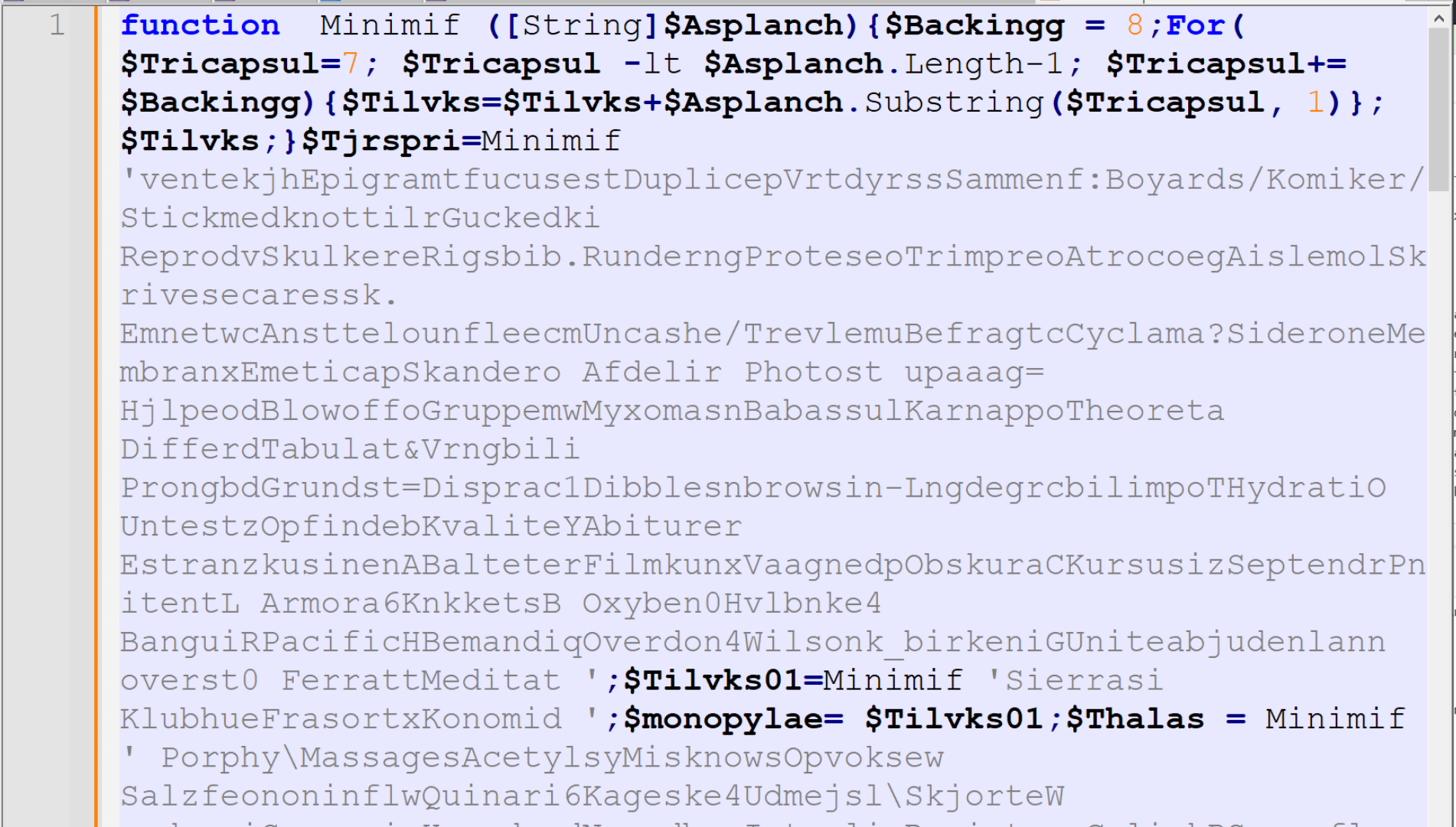Moving the beautified script back into a text editor, we can see that consists almost entirely of obfuscated values being passed to Minimif