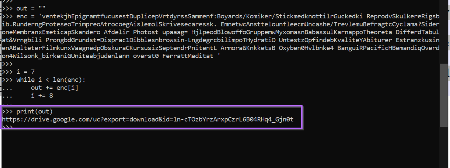By using a simple Python Script, we can test out the decoding method. Immediately the first value returns a URL to a Google Drive file.