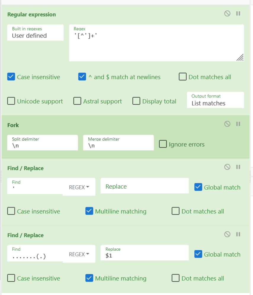 From here we can go ahead and apply a "Fork", which means we can act on each encoded value individually. We can also go ahead and remove the single quotes from each line