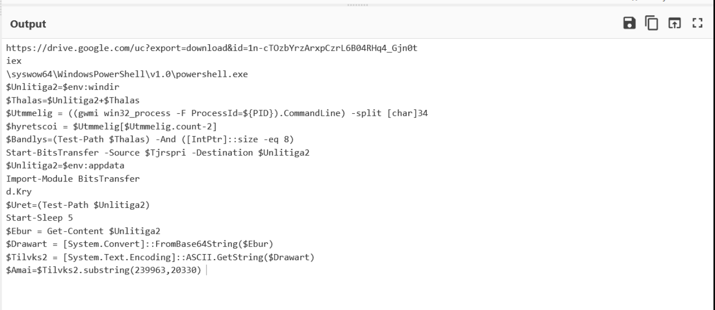 This includes references to the Google Drive URL, PowerShell, BitsTransfer, AppData folder, as well as additional base64 encoding.