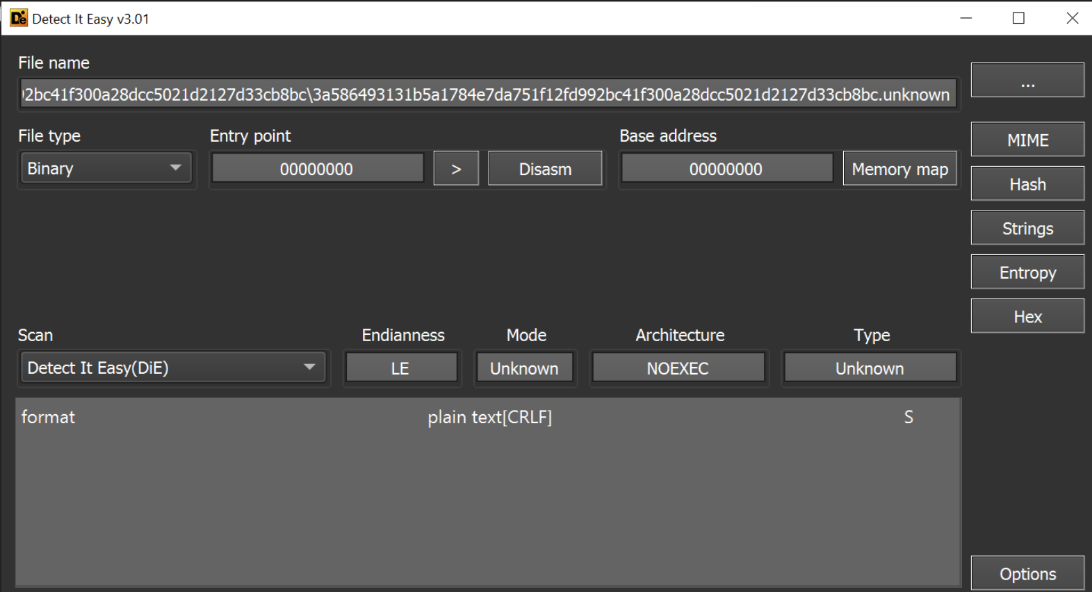 Initial analysis with detect-it-easy shows that it is a plaintext file, so we can largely continue analysis with a text editor. I will be using notepad++.