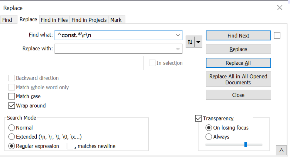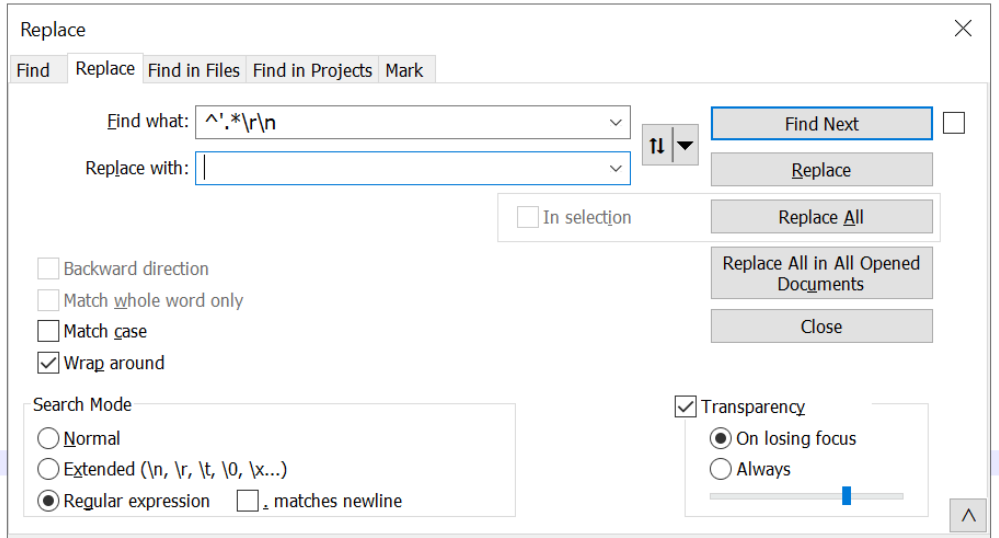 To remove the junk comments, we will use a simple regex and the replace function of notepad++ (CTRL+H).