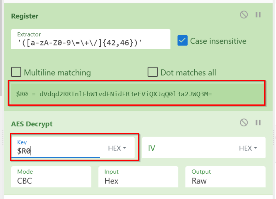 We can utilise regular expressions inside of register operations to extract encryption keys and store these inside of variables.