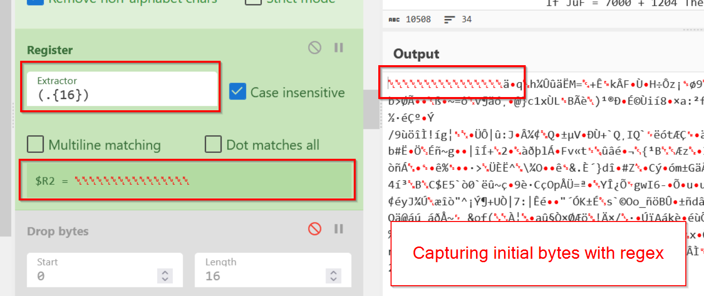 We can leverage regular expressions and registers to extract out the first 16 bytes of the decoded content using .{16}.