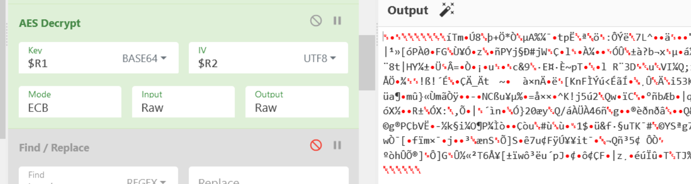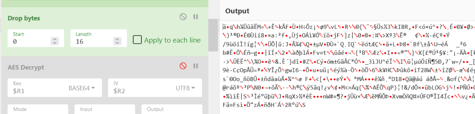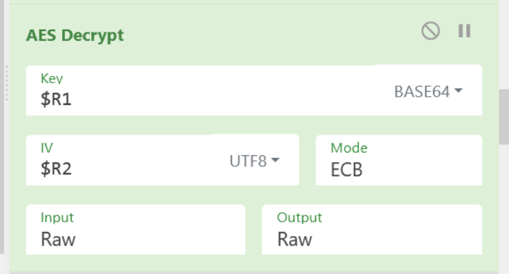 Note how we can access our key and IV via the $R1 and $R2 registers that were previously created. We do not need to specify a key here.
