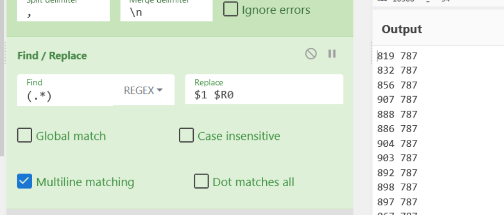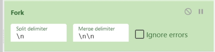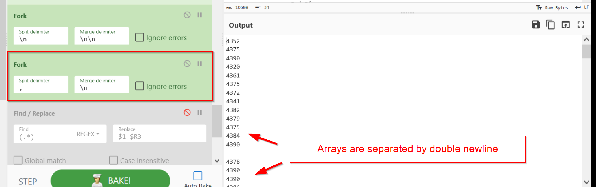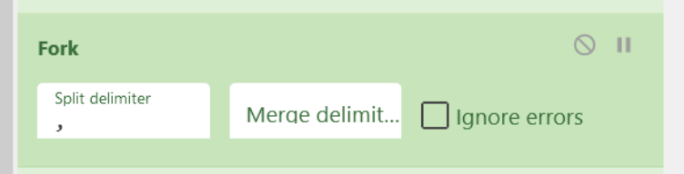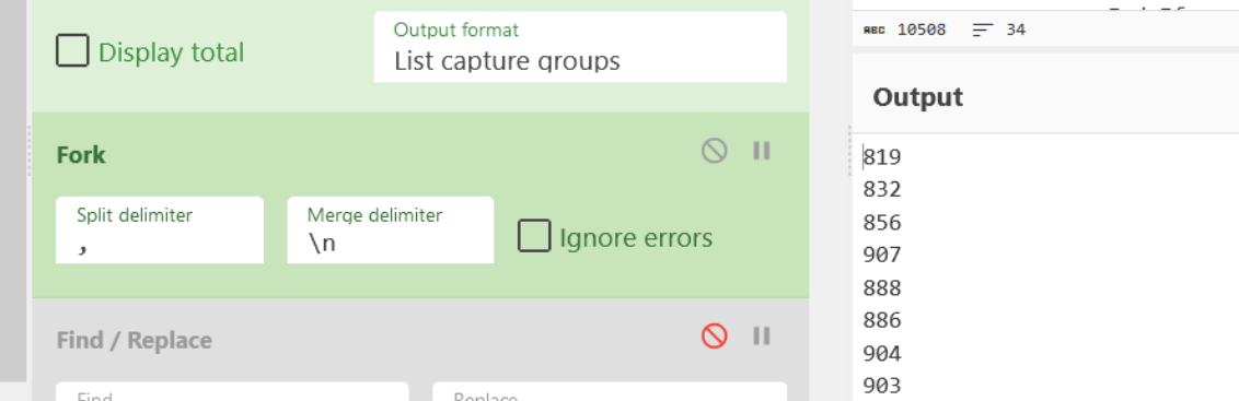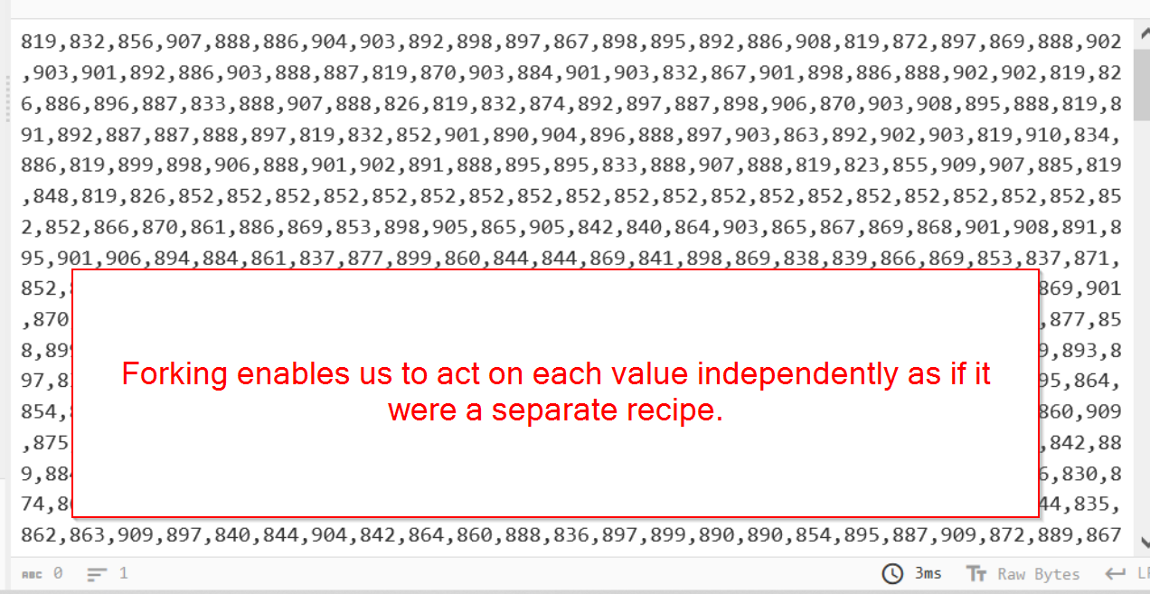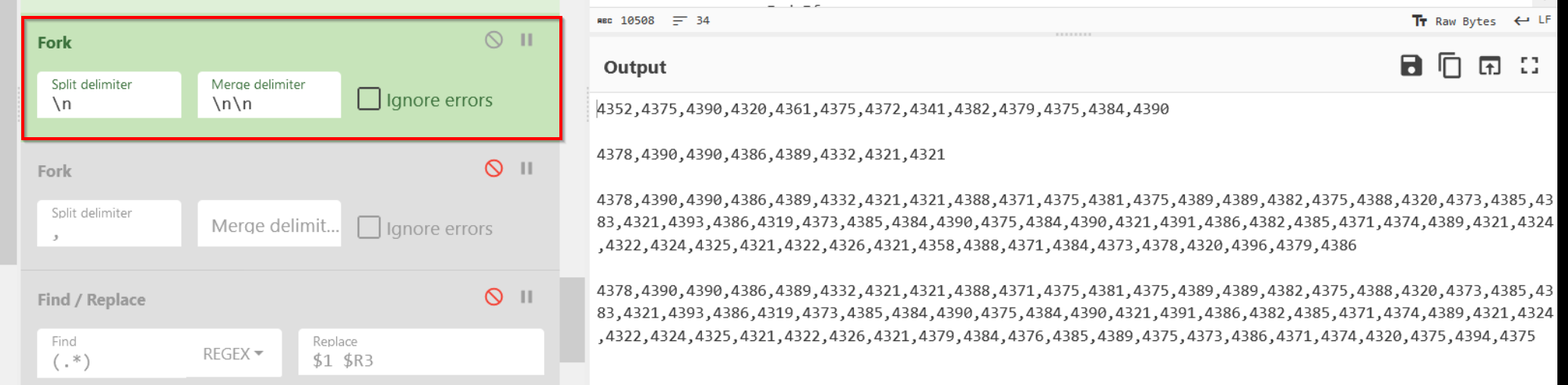 We can do this with another Fork operation, specifying a comma delimiter (as this is what separates our decimal values) and a merge delimiter of newline. Again, this new line does nothing but improve readability.