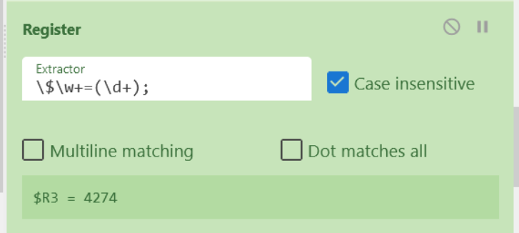 We can do this by creating another register and implementing a regular expression to capture the value $SHY=4274. We can specify a dollar sign, followed by characters, followed by equals, followed by integers, followed by a semicolon.