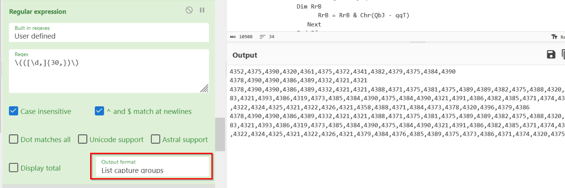 We have also selected List Capture Groupsnew line to list only the captured decimal values and commas.