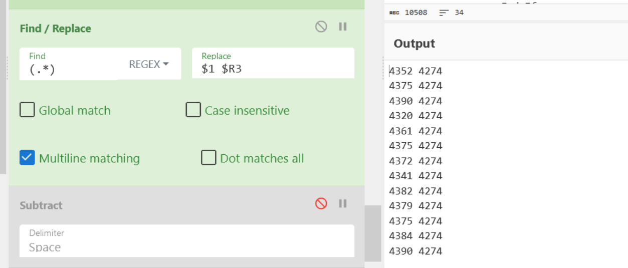 Note that we have specified a space delimiter, as this is what separates our decimal values from our subtraction values in operation 4.