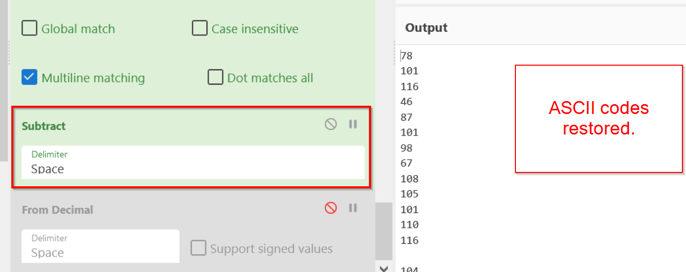We can now decode the ASCII codes using a "From Decimal" operation.