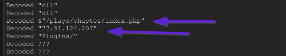 A partial output of this can be seen below. Observing that the ip 77.91.124[.]207 has been extracted alongside a partial URL.