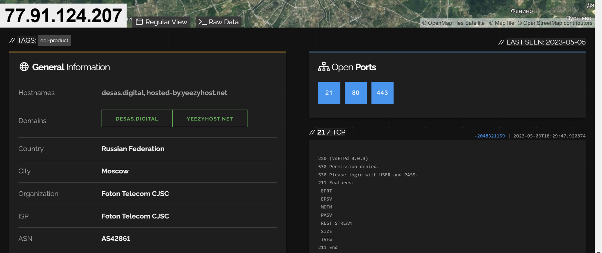 Our first search was a plain search for the original Amadey C2 of 77.91.124[.]207 (without the [.]), this identified a running server with three open ports. 21,80,443