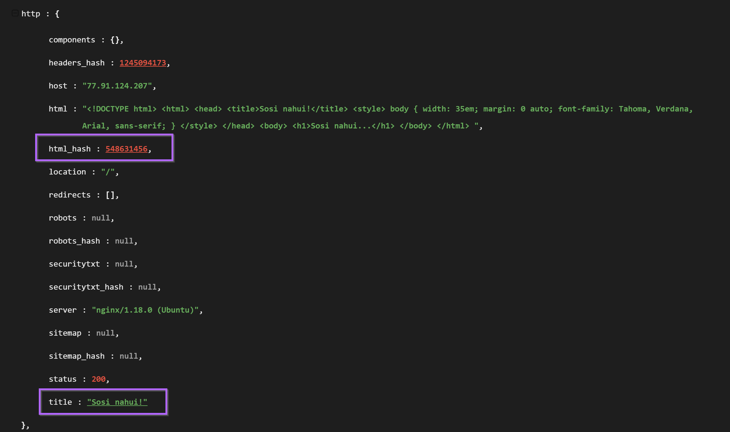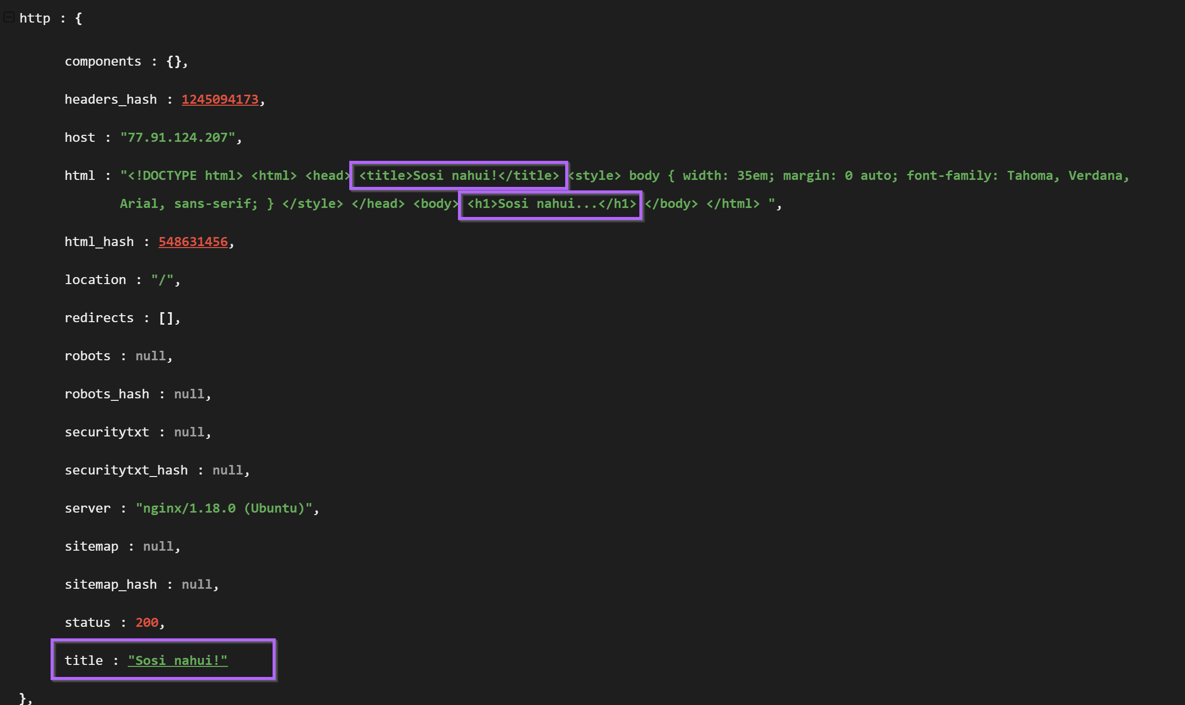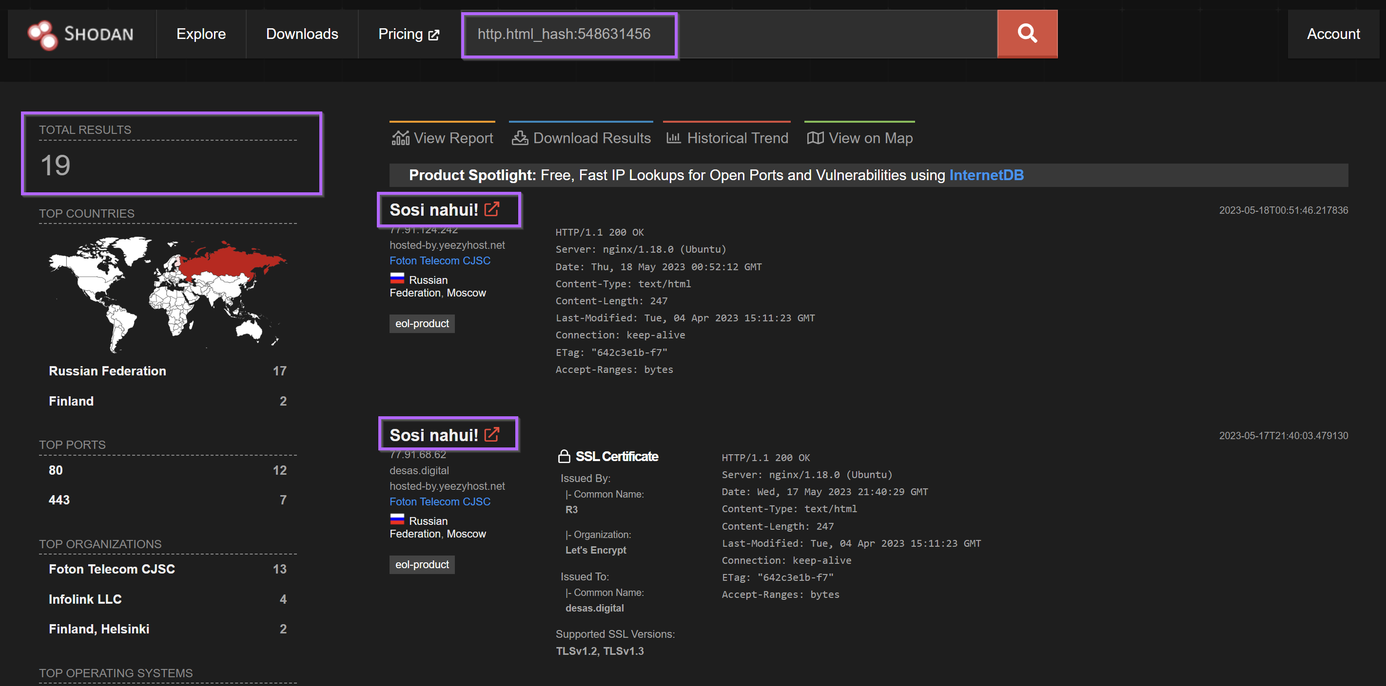 Pivoting with the html_hash produced 19 results for similar servers. Each server had an identical html title of "Sosi Nahui!" and were all based in either Russia Finland. For me, this was enough similarity to begin assuming similar origin.