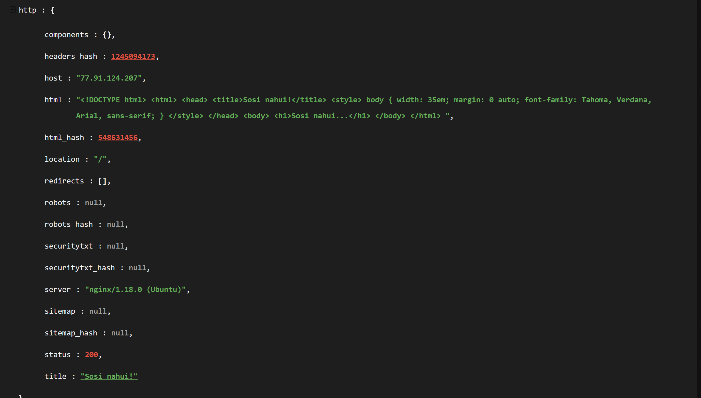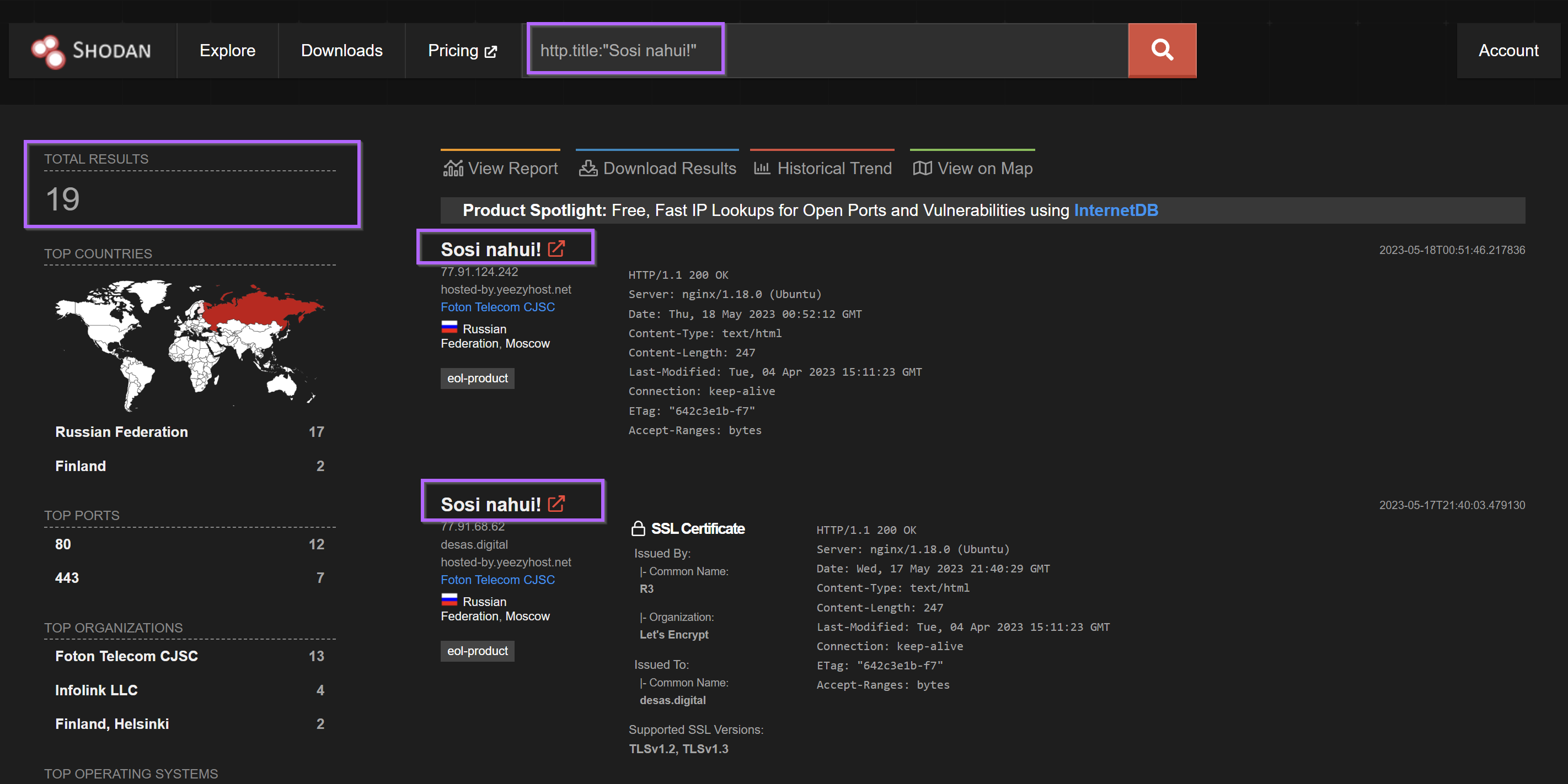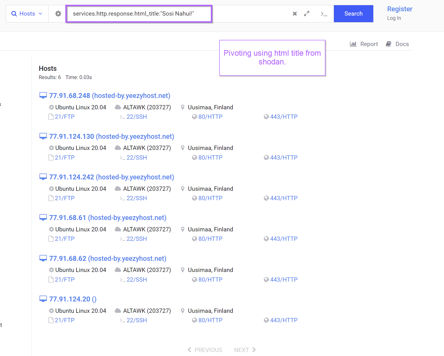 Pivoting with the html_hash produced 19 results for similar servers. Each server had an identical html title of "Sosi Nahui!" and were all based in either Russia Finland. For me, this was enough similarity to begin assuming similar origin.