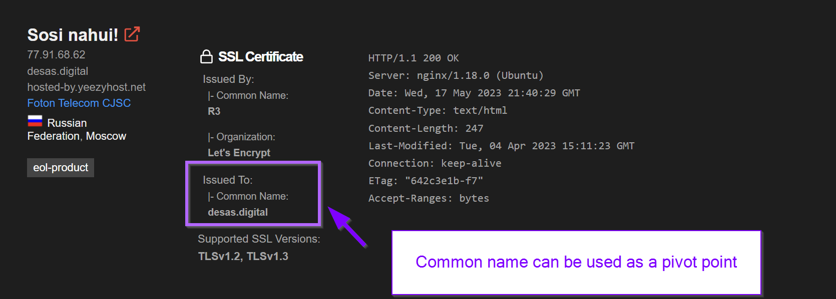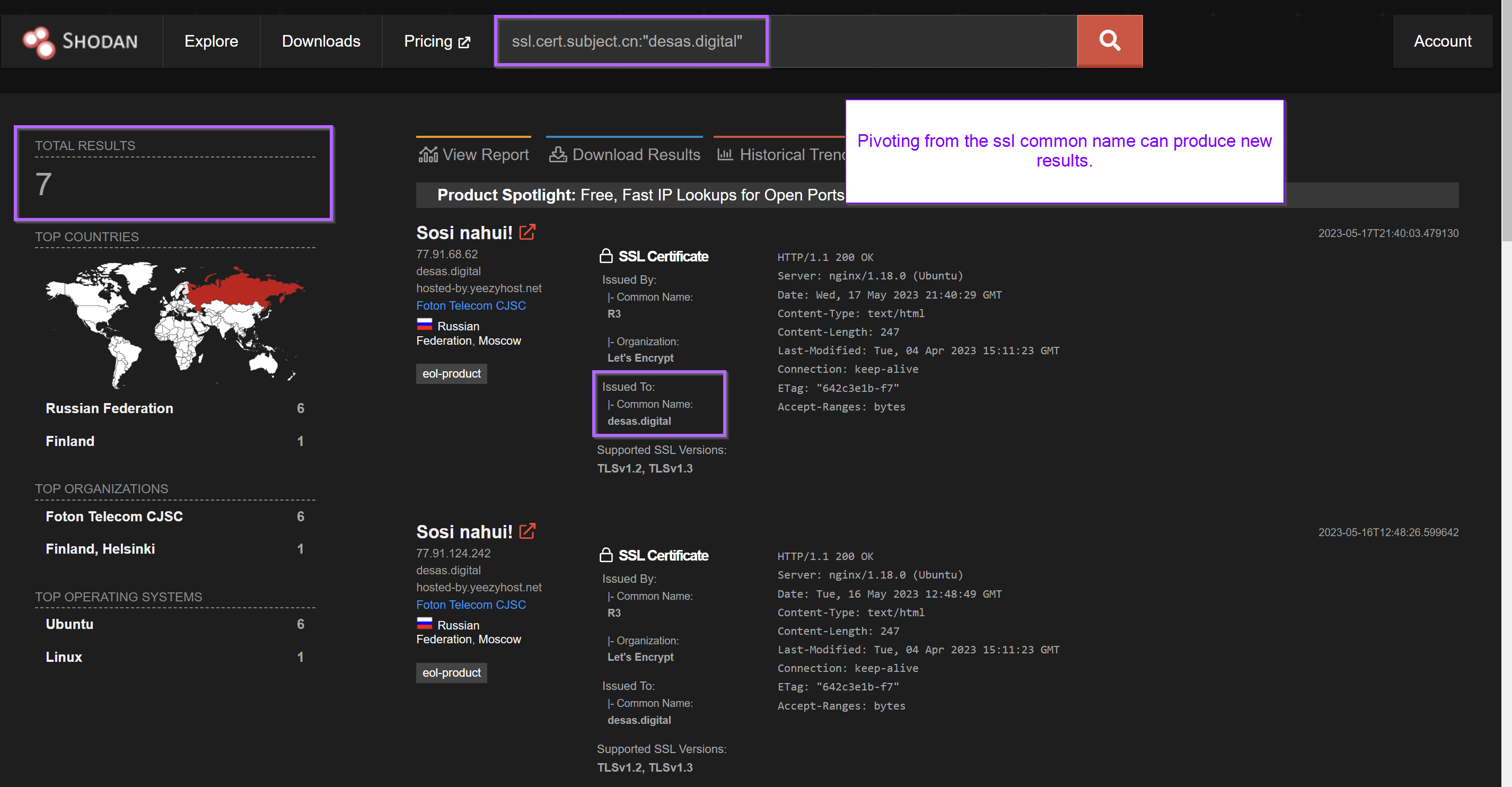 Pivoting with the subject common name can produce new results and additional servers. In this case, no new servers were found.