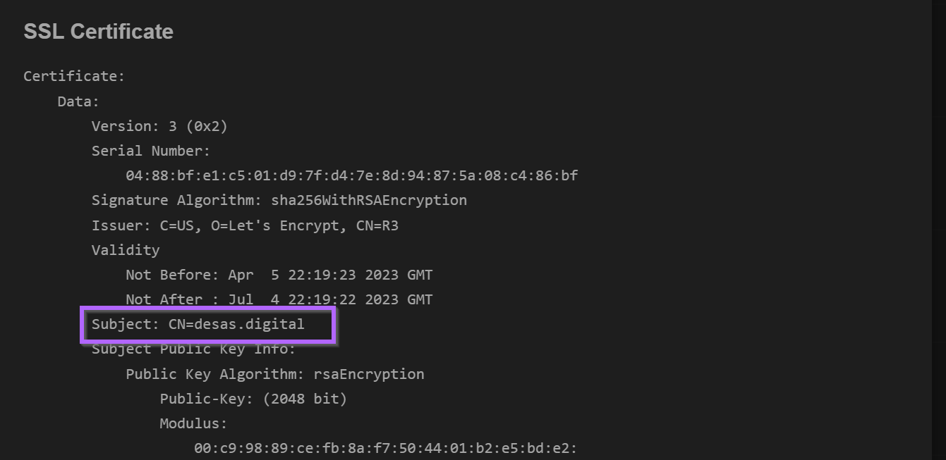 Port 443 also contained references to the same desas.digital certificate that was previously identified.