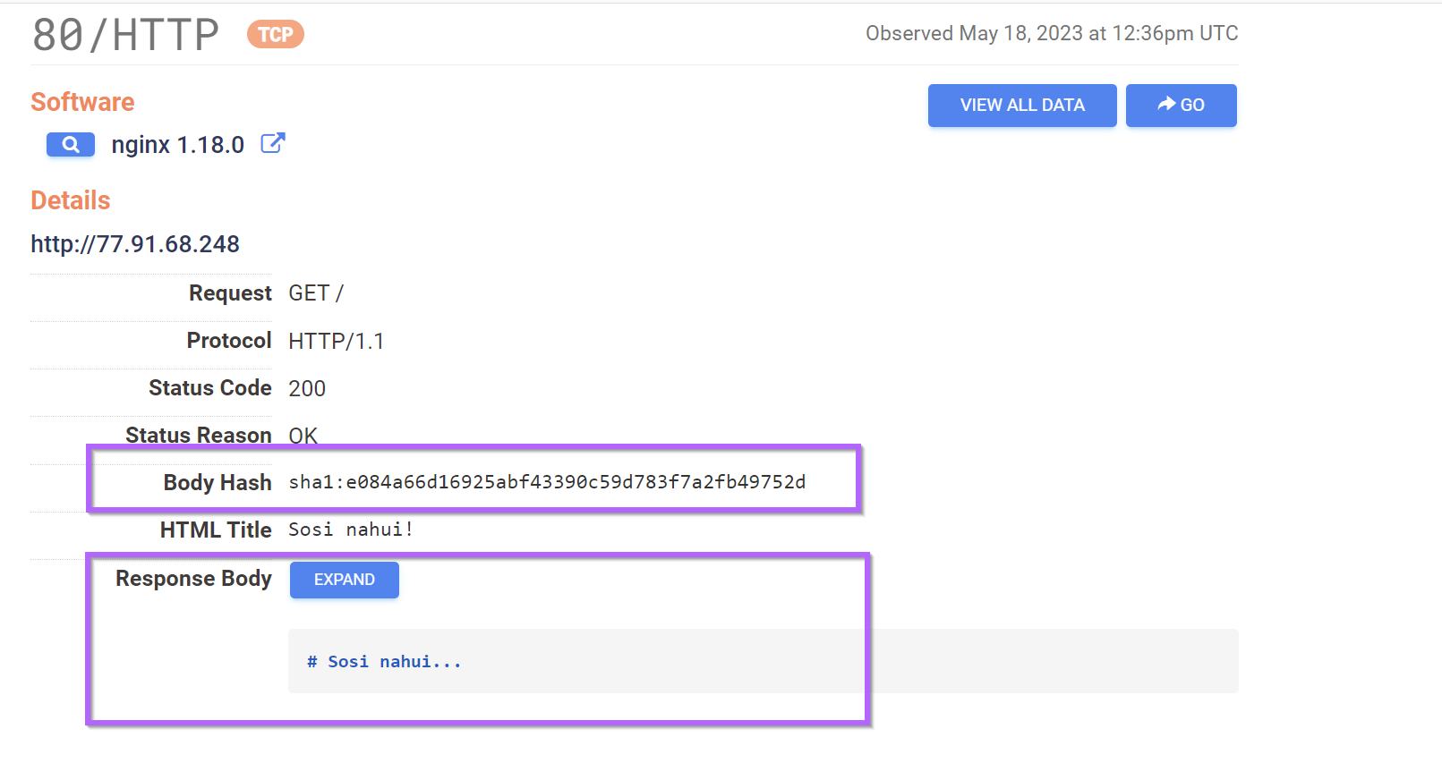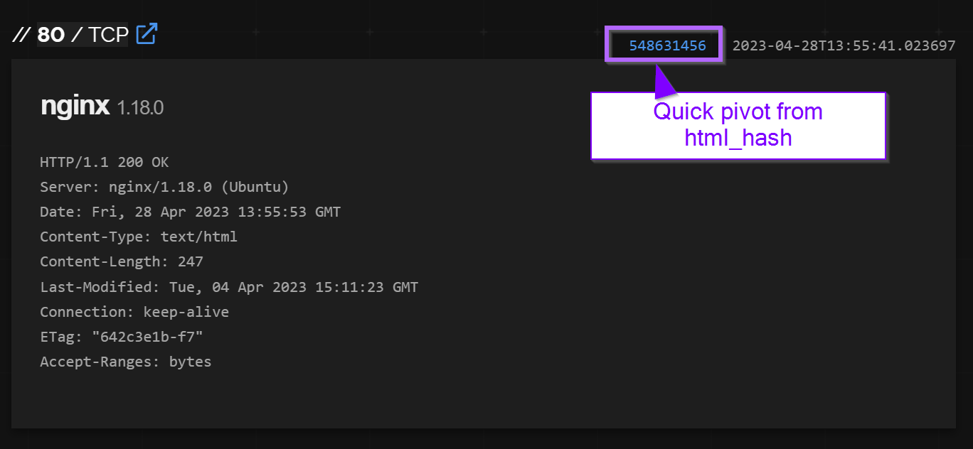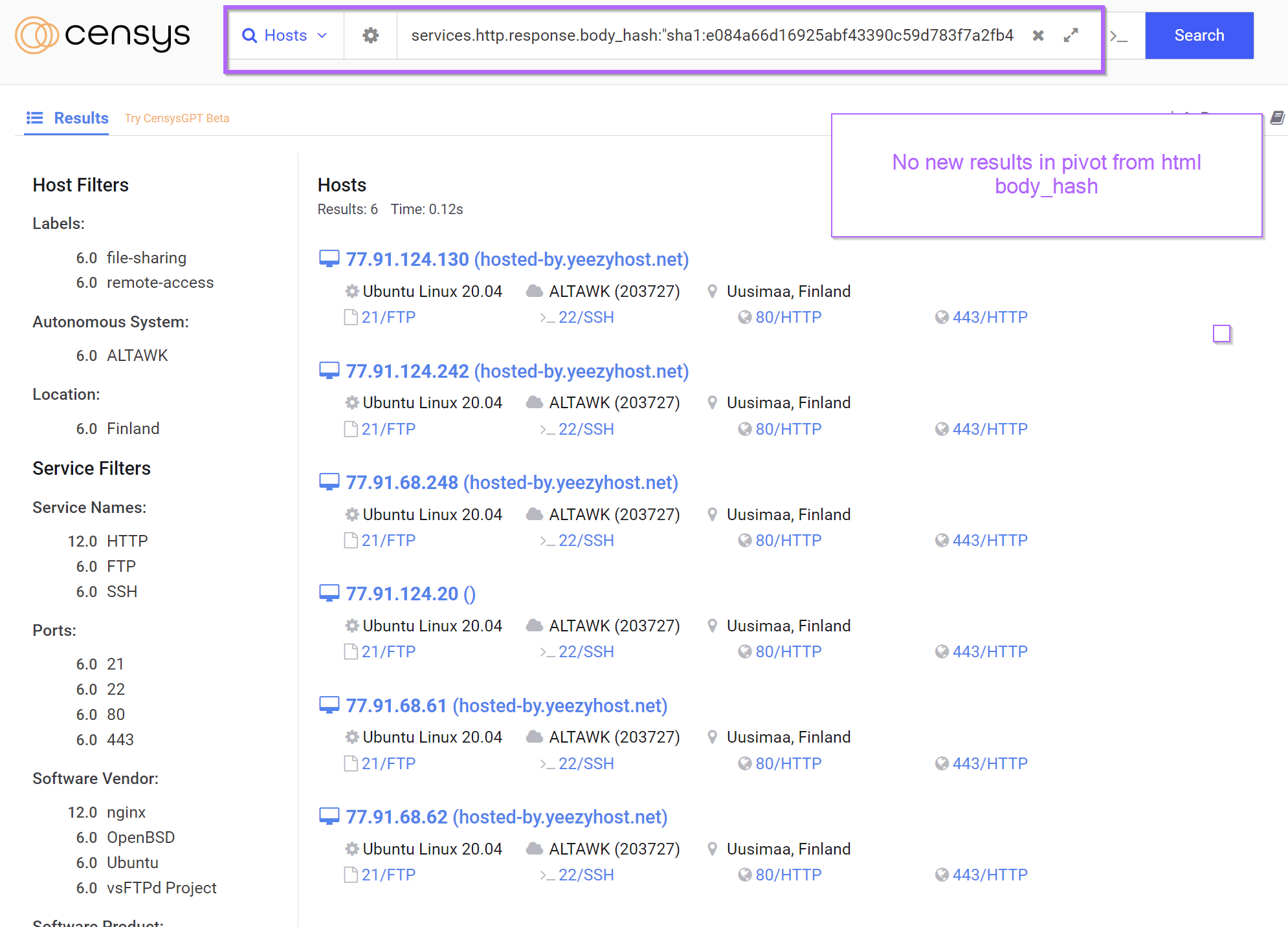 The Censys page for 77.91.68[.]248 contained references to a body hash which could be useful for additional pivoting.