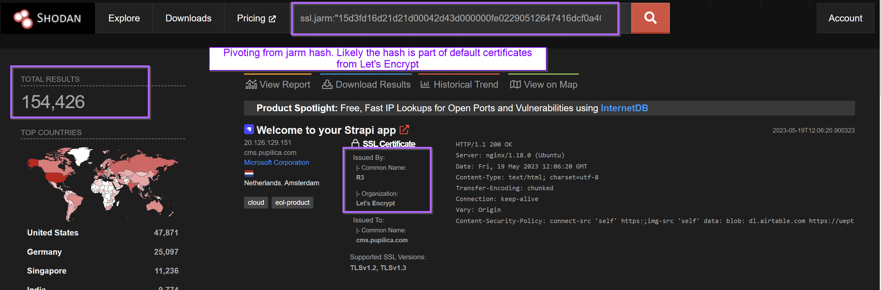 Pivoting from the Jarm hash produced 154,426 results.