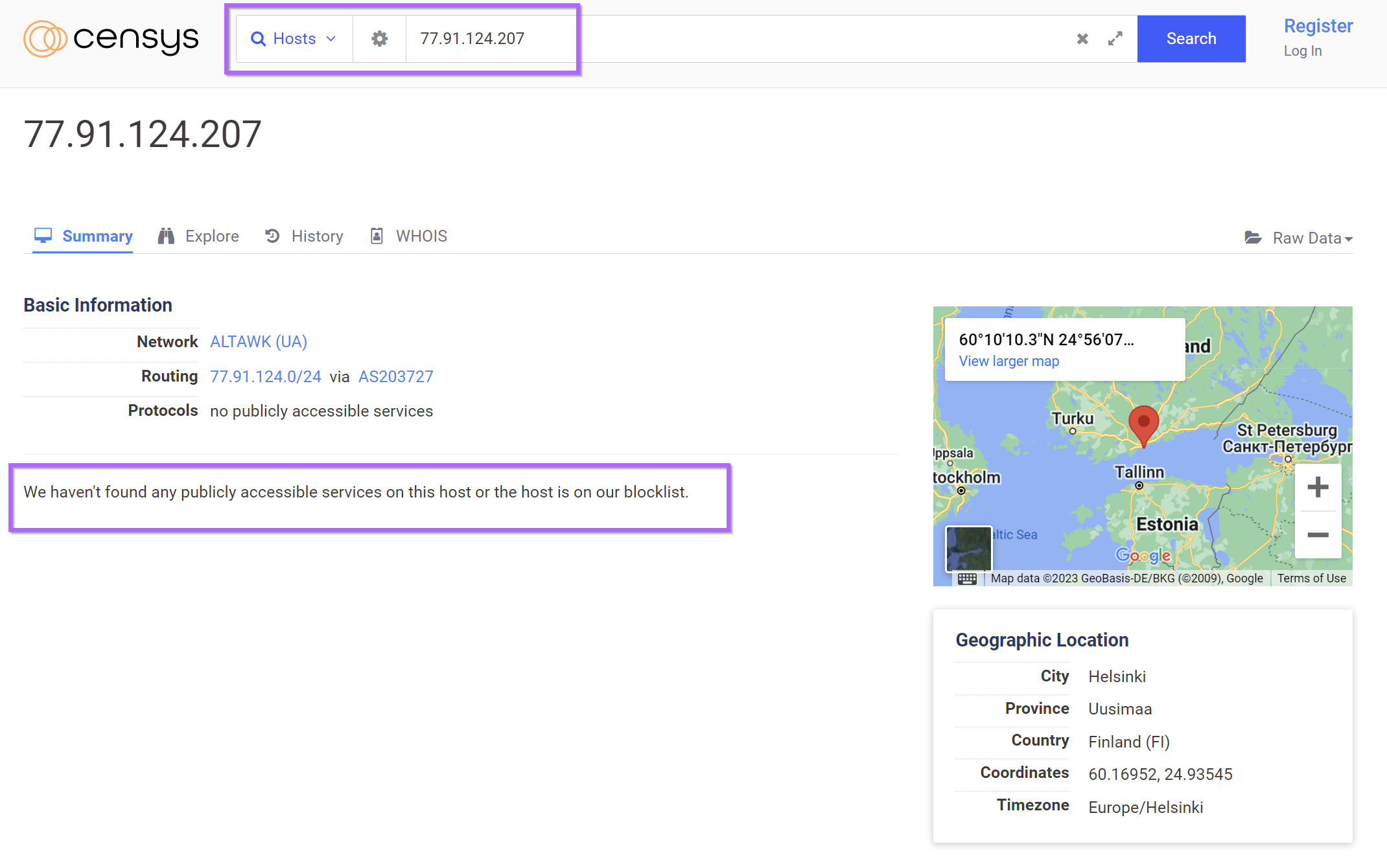 A Censys search for the ip 77.91.124.207 returned the ip with no running services. Censys has likely performed a scan whilst the server was down or not responding to Censys headers.