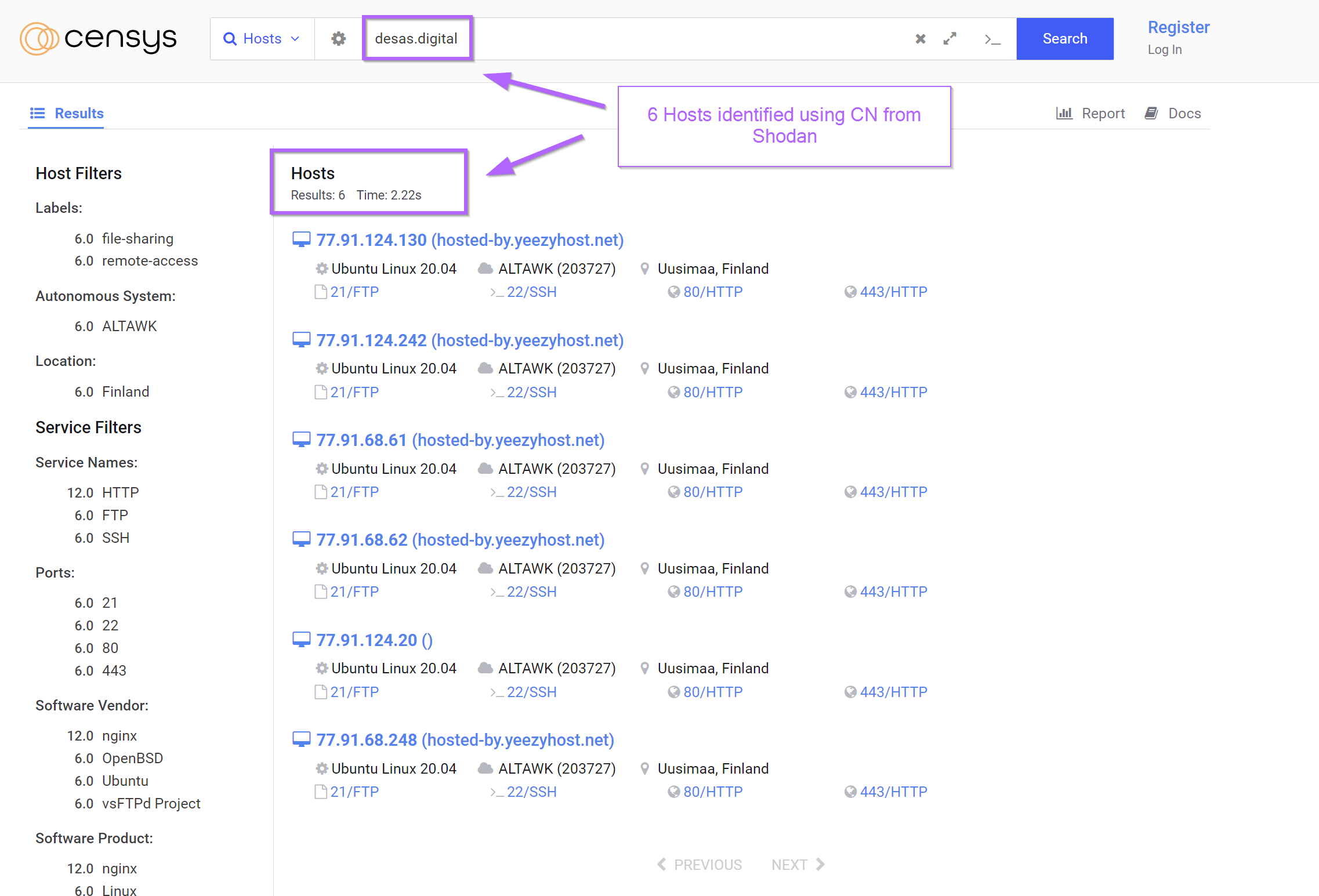 Seven results could be found by modifying the Shodan query to ssl.cert.subject.cn:"desas.digital".