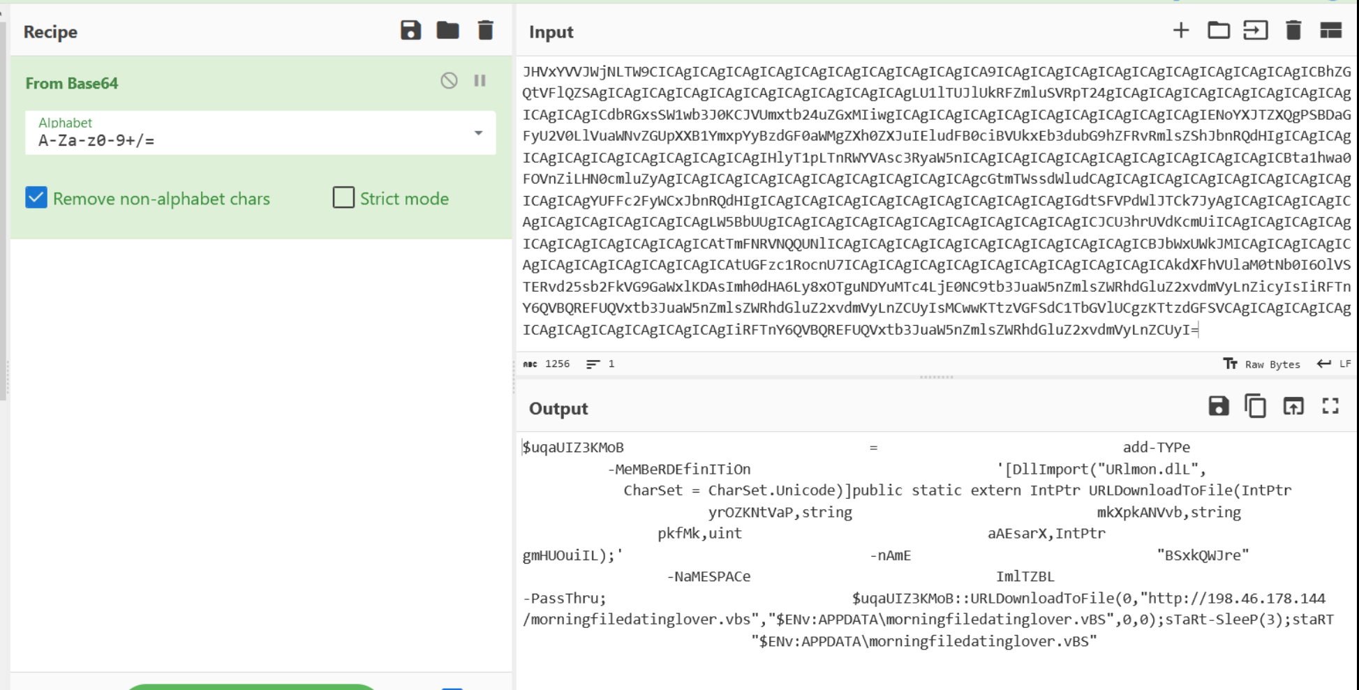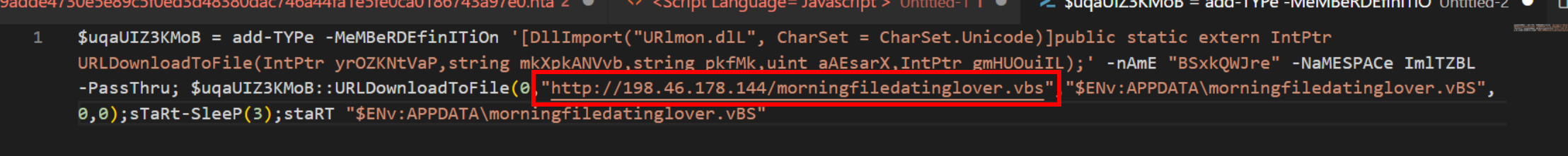 The address of the next stage file is also clearly visible, and contains the value http://198.46[.]178.144/morningfiledatinglover[.]vbs