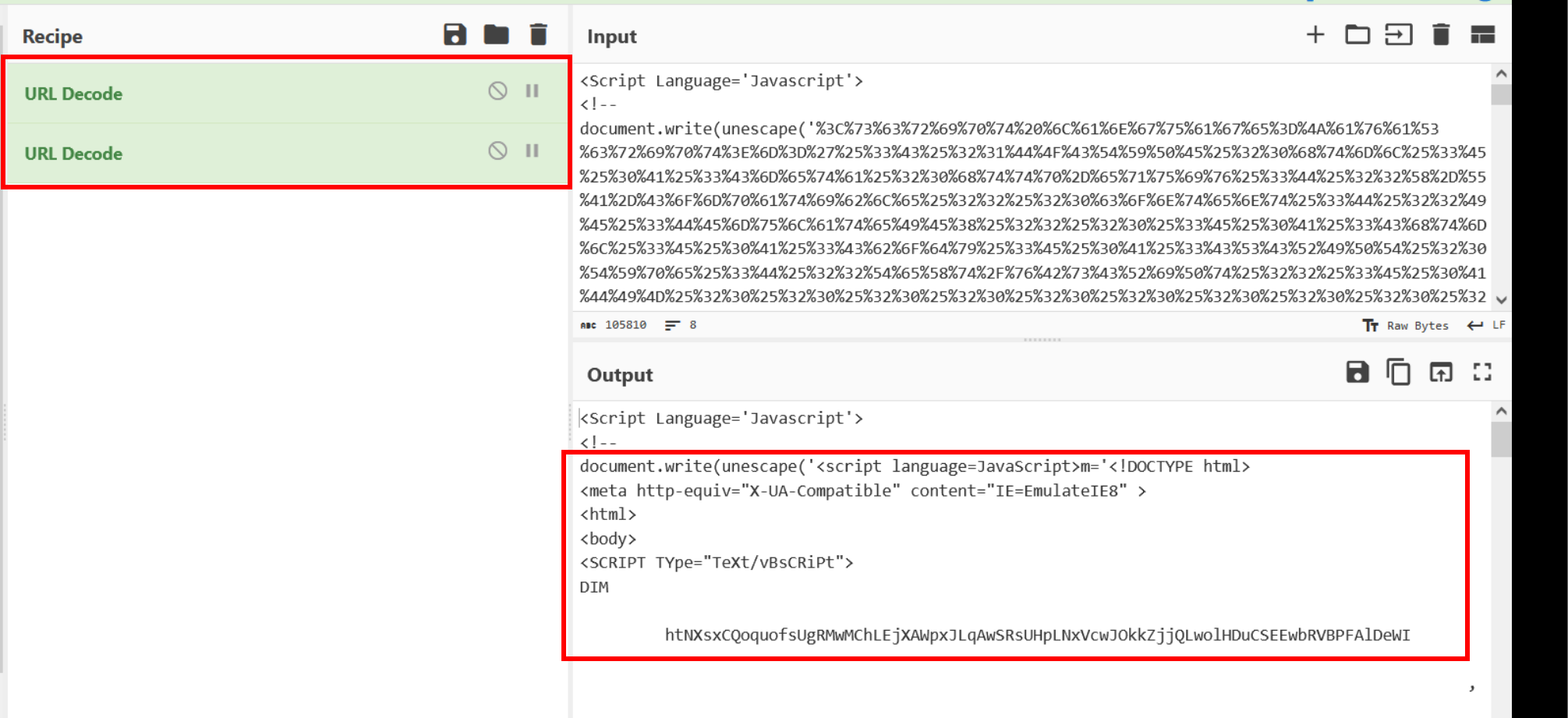 The first step to decoding the URL encoded content is to use a tool like CyberChef and the URL Decode operation.