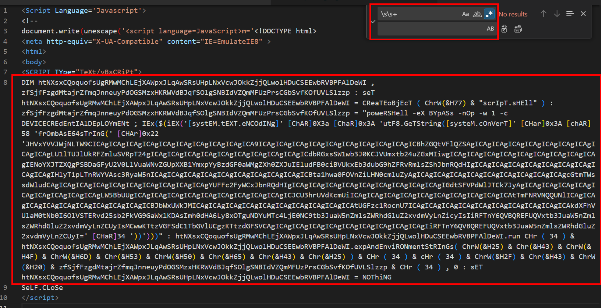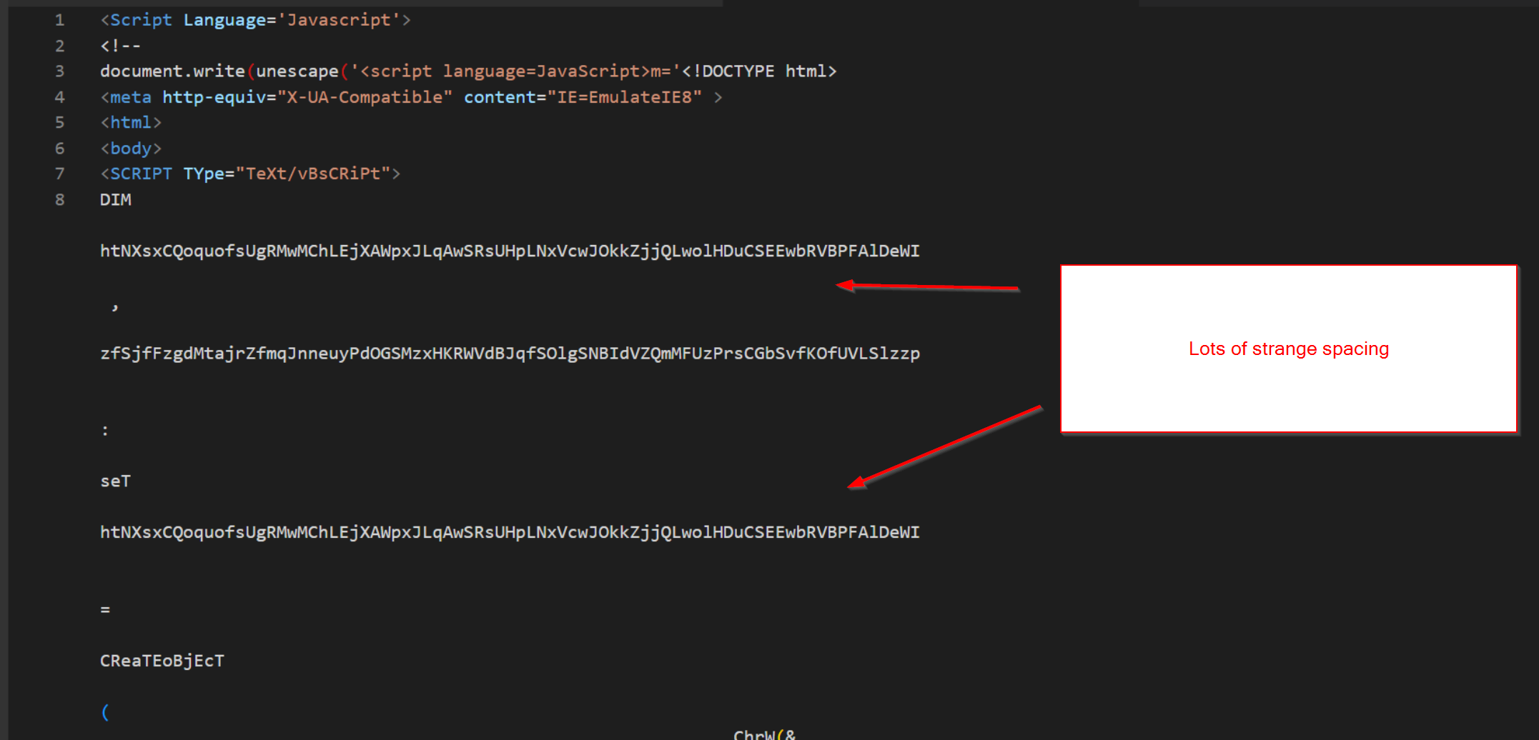 Although the script is removed of URL encoding, the script now employs blobs of spaces to hinder analysis. This can be seen in the screenshot below.