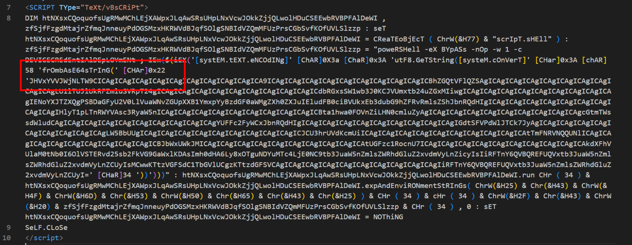 A large blob of base64 content can be seen in the resulting content. This is alongside the key giveaway of frombase64string with random upper and lower casing.