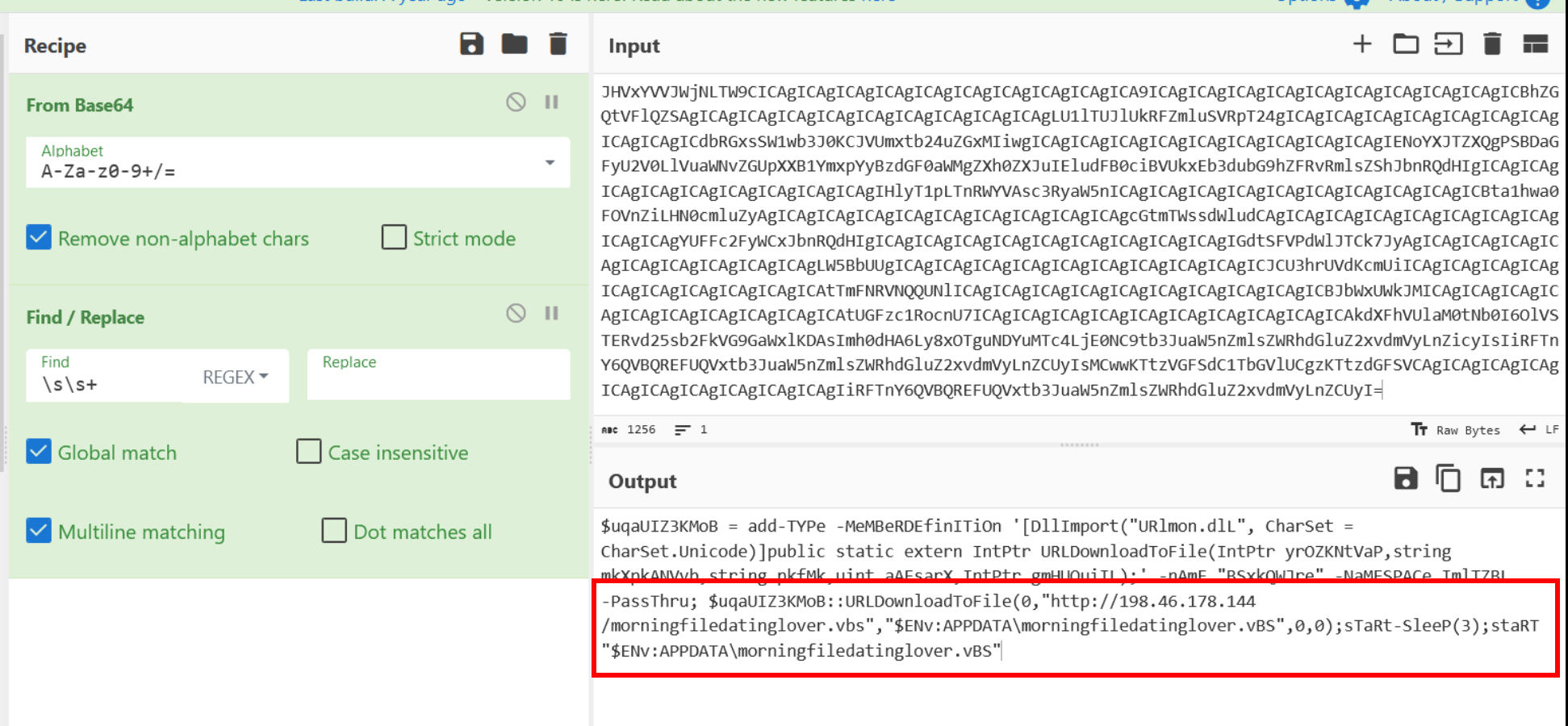 Below we can see the From Base64 operation and the removal of excessive spacing via regex.