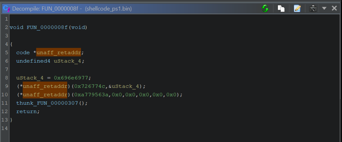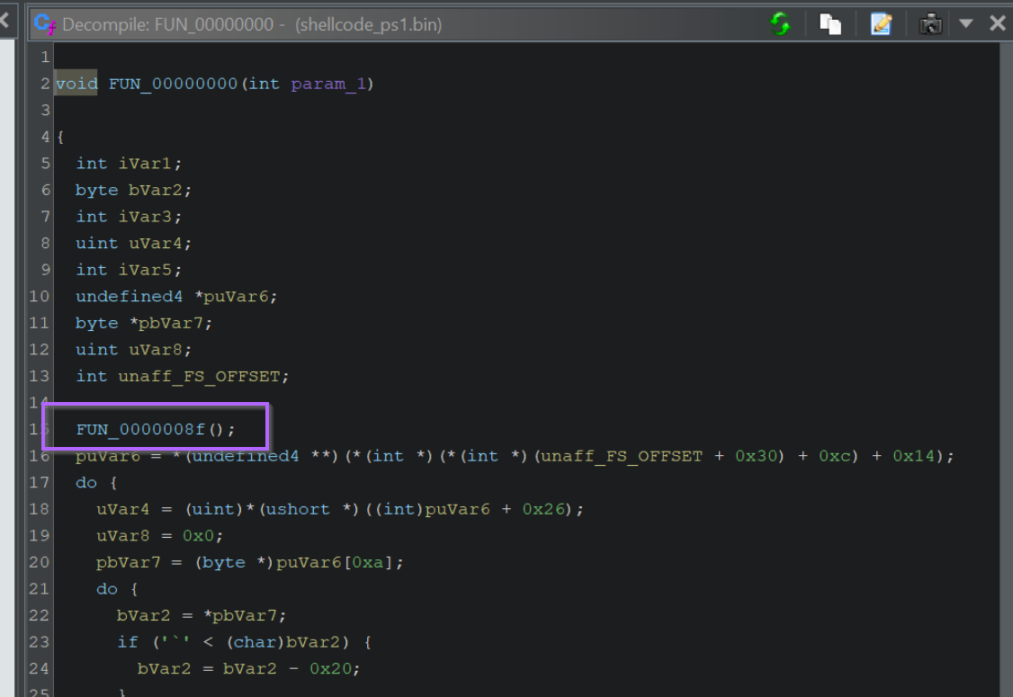 Returning to Ghidra, we can see this value corresponds to the next instruction after FUN_0000008f is called.