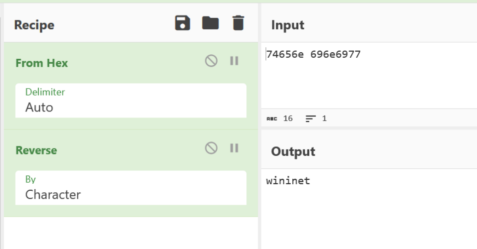 If we recall that there was another hex value that looked like an API hash, we can see now that it is actually the (hex-encoded) name of the library to load wininet.