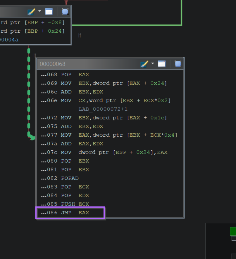 Zooming in on the Graph, we can observe the same JMP EAX instruction at the very end of the function.