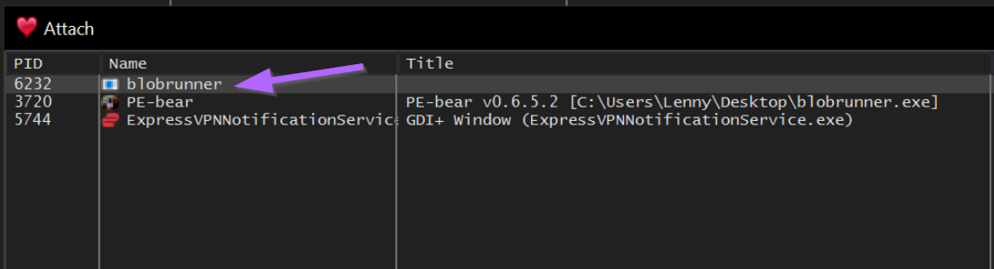 We can do this with x32dbg by opening up x32dbg and selecting File -> Attach and then selecting our blobrunner process.