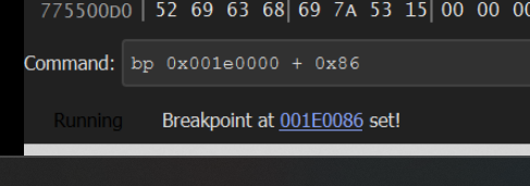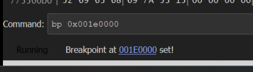 We can then use the bottom left corner to create a breakpoint at the location provided by blobrunner. bp 0x001e0000