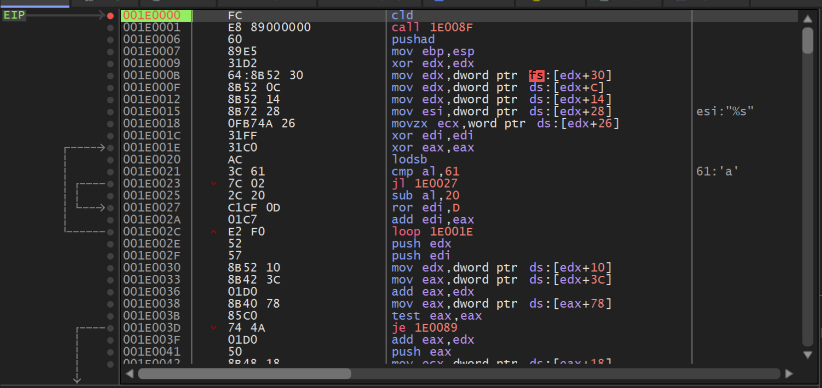 Within x32dbg, we should now have hit a breakpoint at the beginning of the Shellcode.