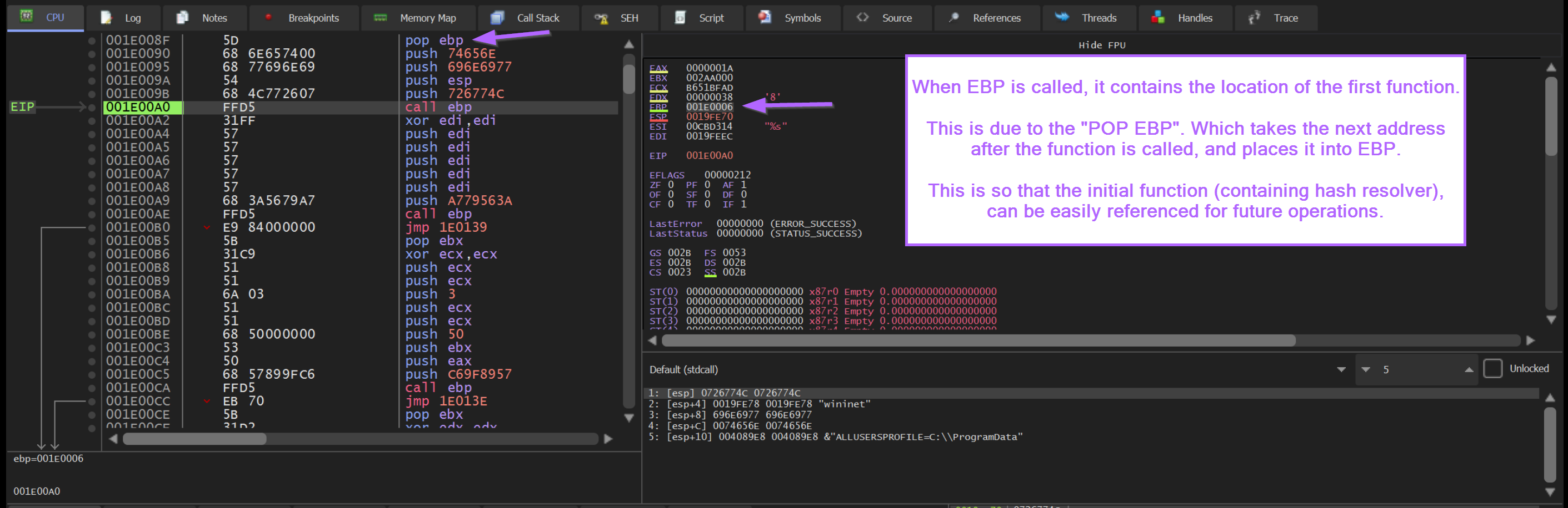 Now if we press F9 to continue execution, we will hit a breakpoint on the first Call EBP. From here we can observe the hash value of 0x726774c contained on the stack.