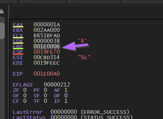 We can see this below, where the instruction pointer EIP is at 0x1e0000 + 0x86.
